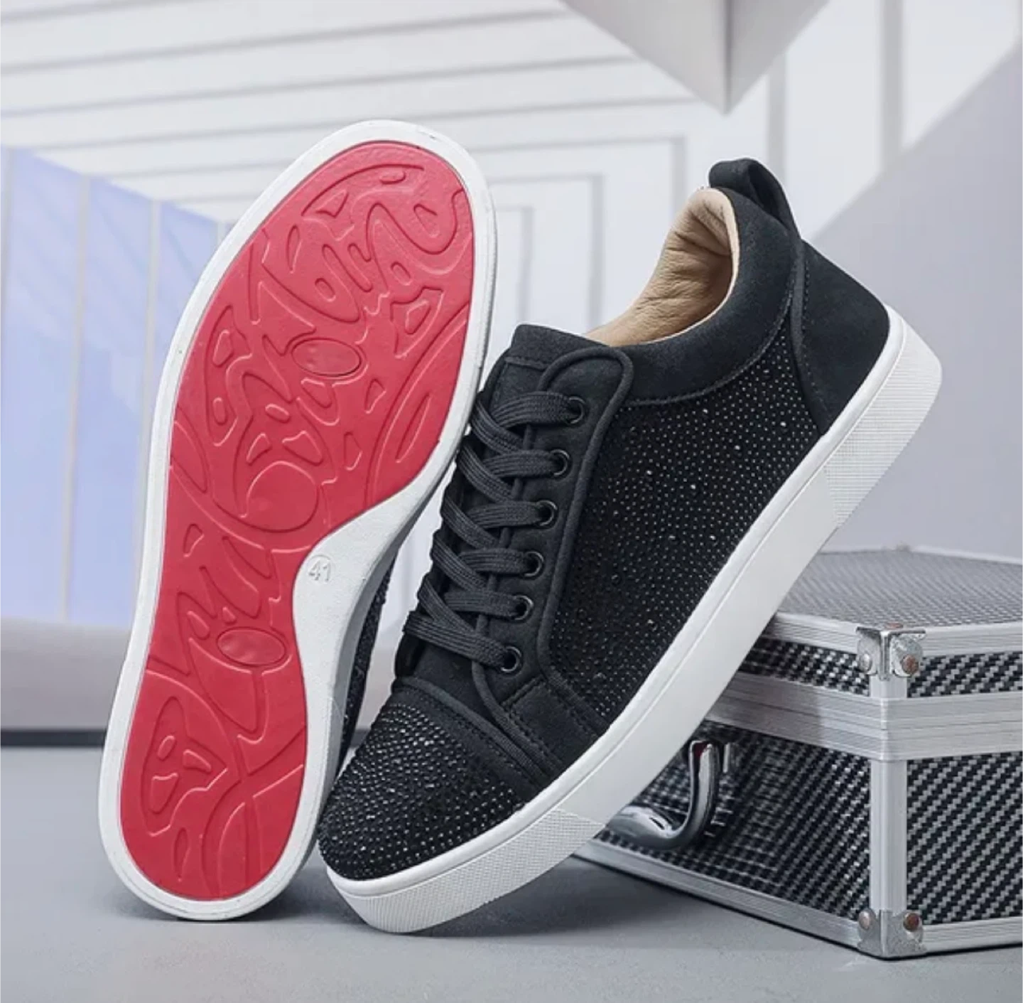 10Selling a pair of stylish black sneakers with rhinestone detailing! They have a white sole and a red patterned outsole. These would be a great addition to your wardrobe!