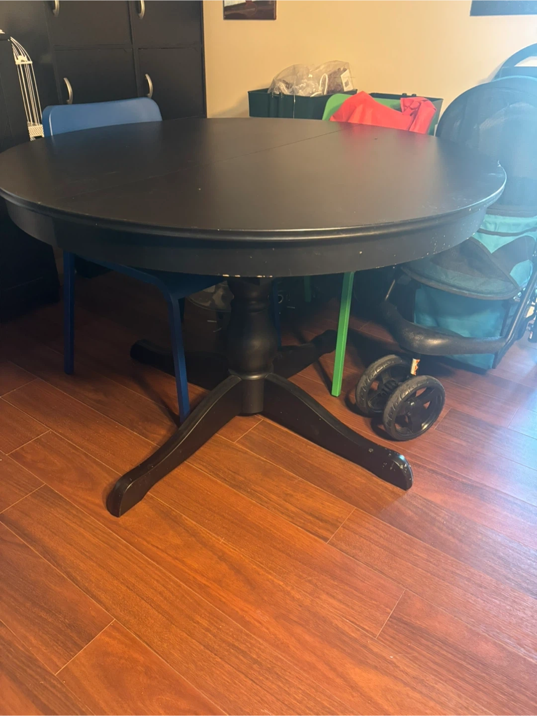 Selling a round dining table in black. It's in good condition and would be perfect for a small dining area or kitchen. The table has a classic pedestal base and a smooth, round top. It comfortably seats 4 people.