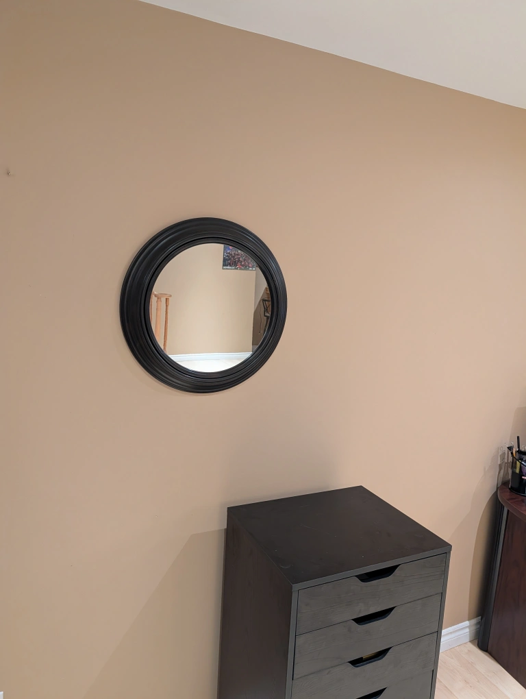 Selling a nice round wall mirror with a black frame. It's in great condition and would look lovely in any room of the house