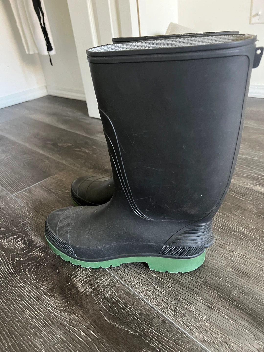69Selling a pair of black rubber rain boots! They're in good condition and perfect for rainy days or gardening. The soles are a fun green colour!