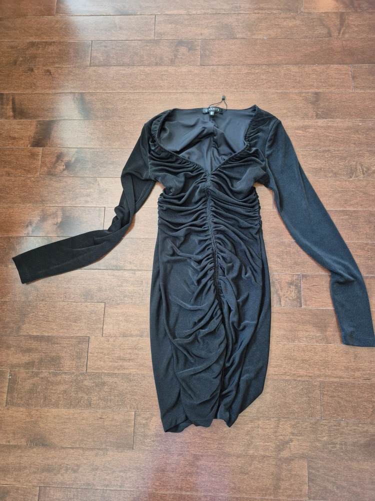 This is ai ruched long sleeve dress in black. It's in great condition and ready for a new home. The dress features a flattering ruched design that accentuates your figure. Perfect for a night out or a special occasion!