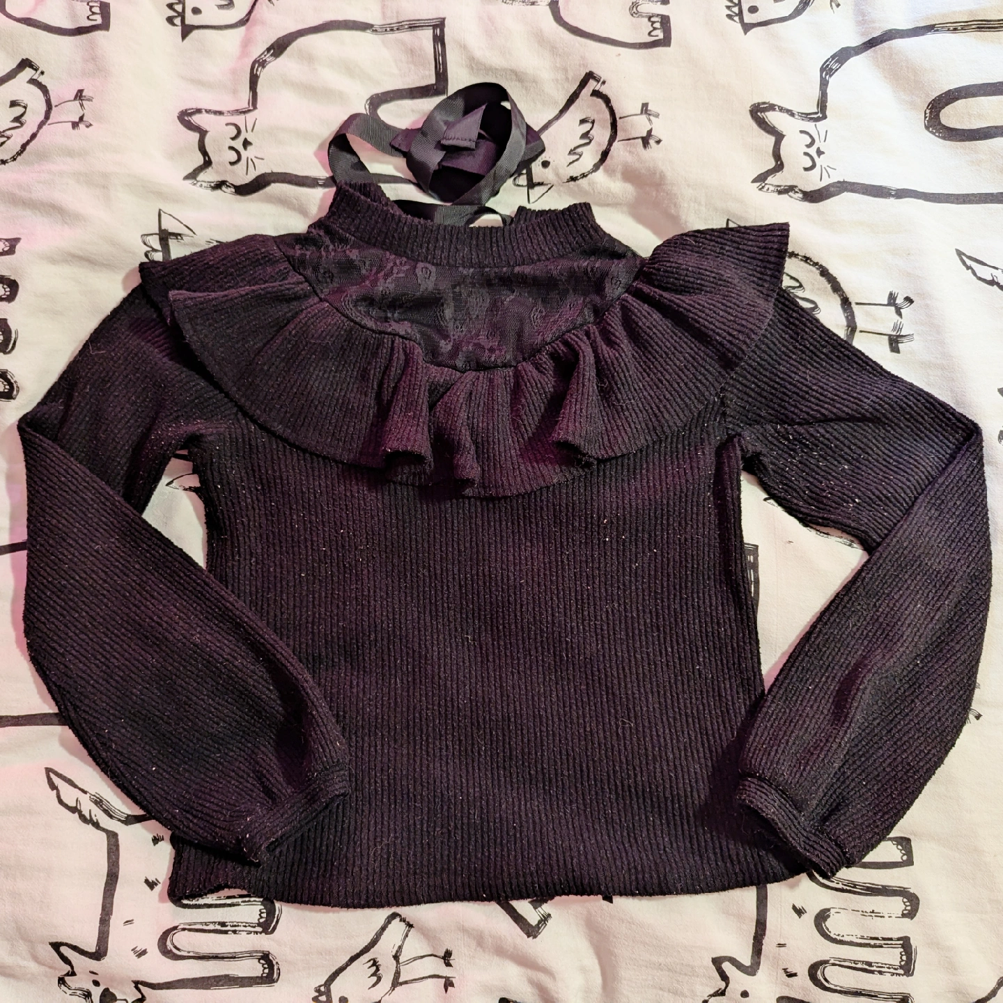 Black Ruffle Neck Long Sleeve Top, size S