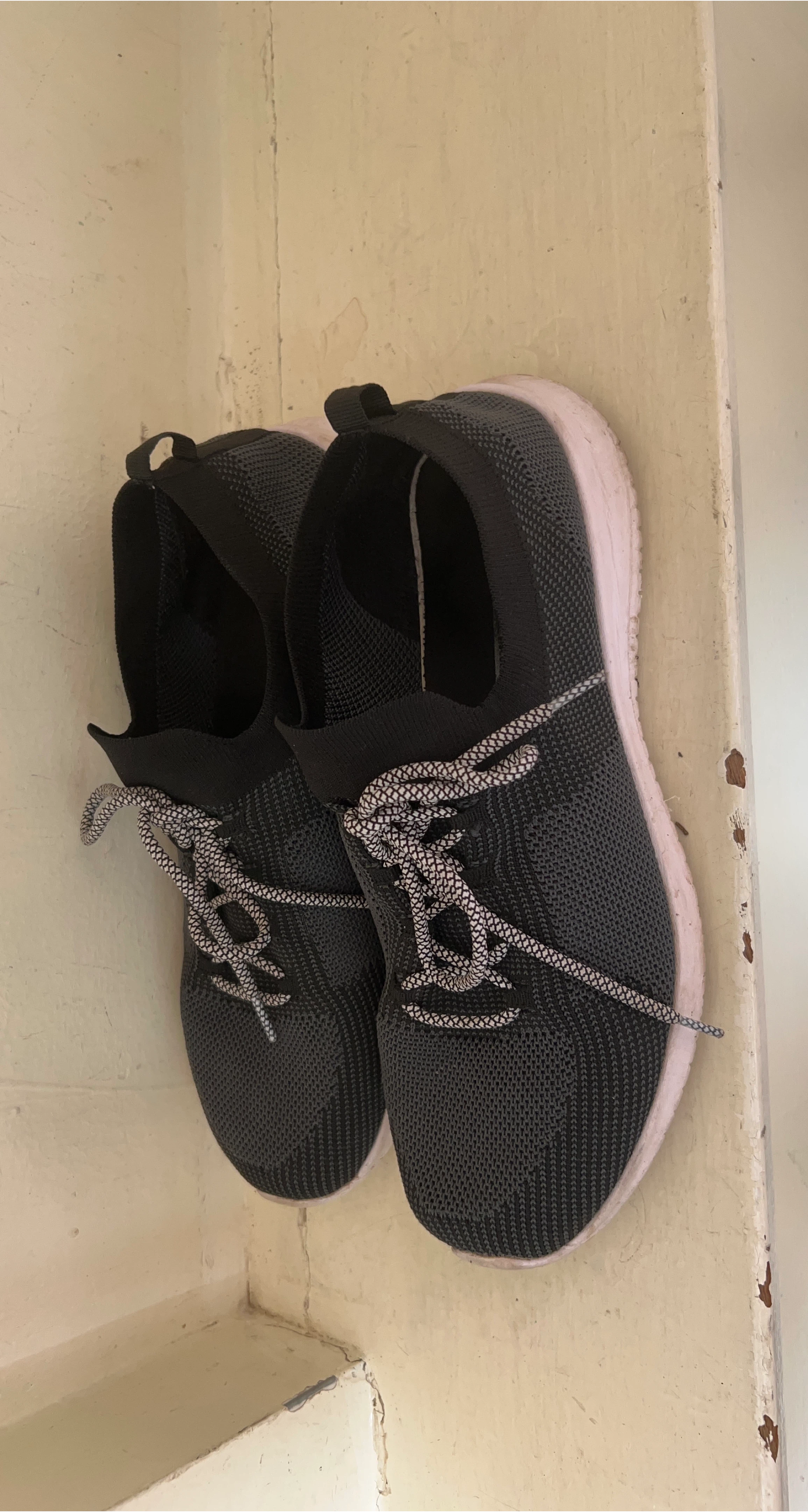 Selling a pair of black running shoes. They show some signs of wear, especially on the bottom, but still have plenty of life left in them for casual jogs or walks. They're lightweight and comfortable, perfect for everyday use