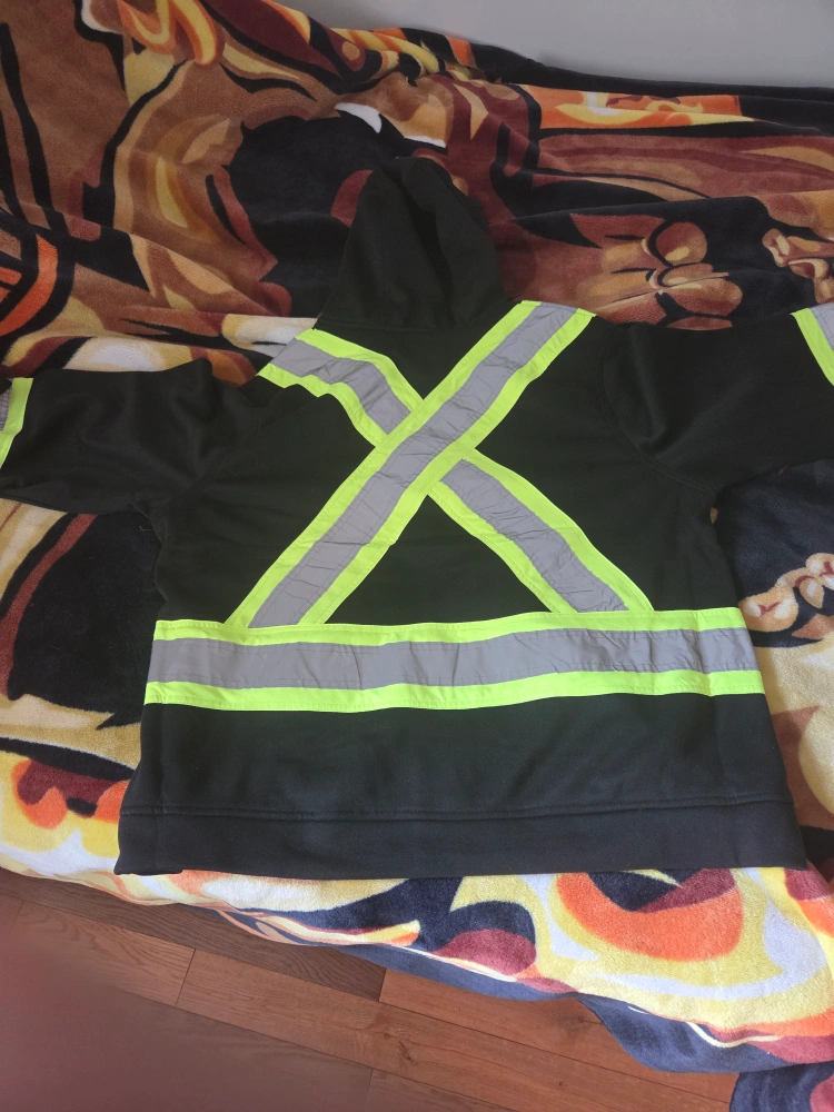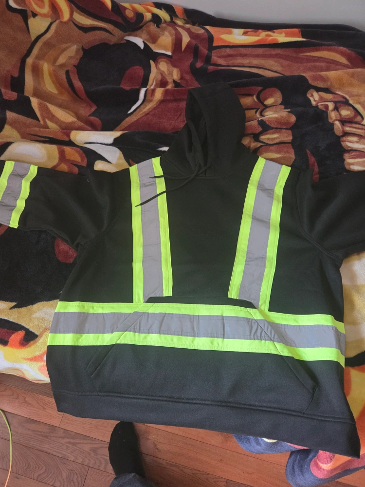 Selling a black safety hoodie with reflective stripes. It's in great condition and perfect for staying visible in low-light conditions. The reflective stripes are bright and cover the front, back, and arms. Stay safe and be seen! its xL