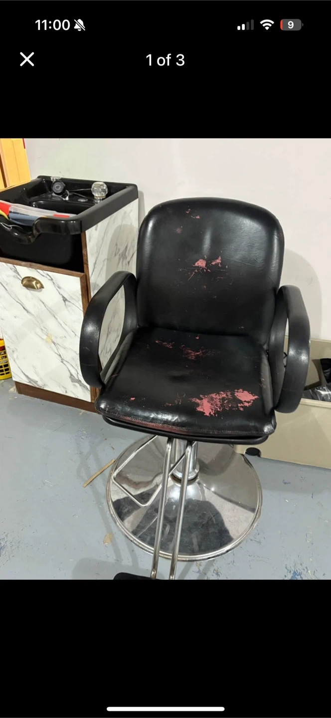 Selling a salon chair with a black seat and a hydraulic base. It shows some signs of wear on the seat, but it's still functional and ready for use in your salon or home setup