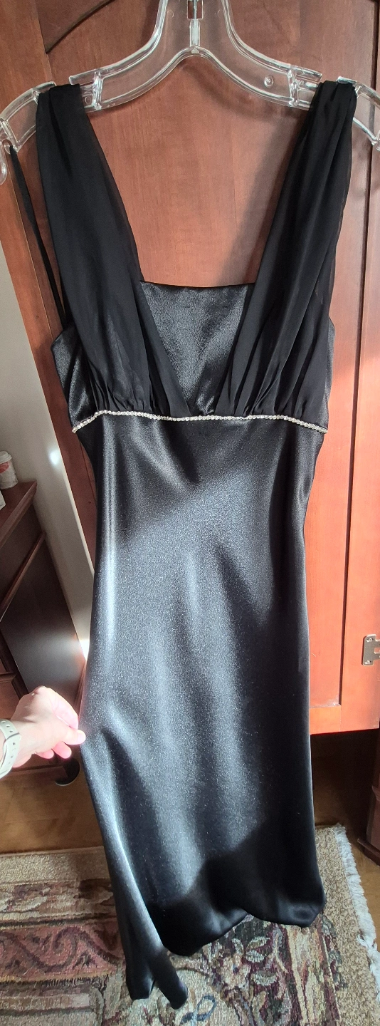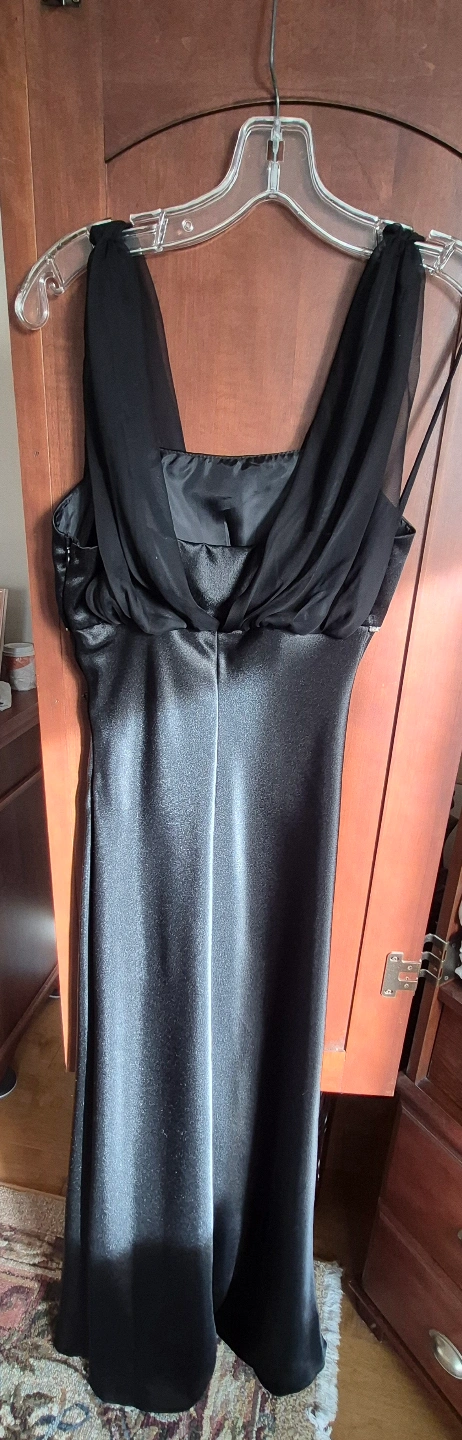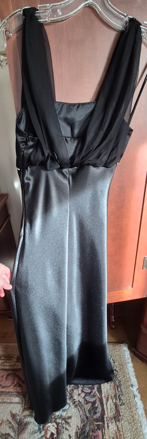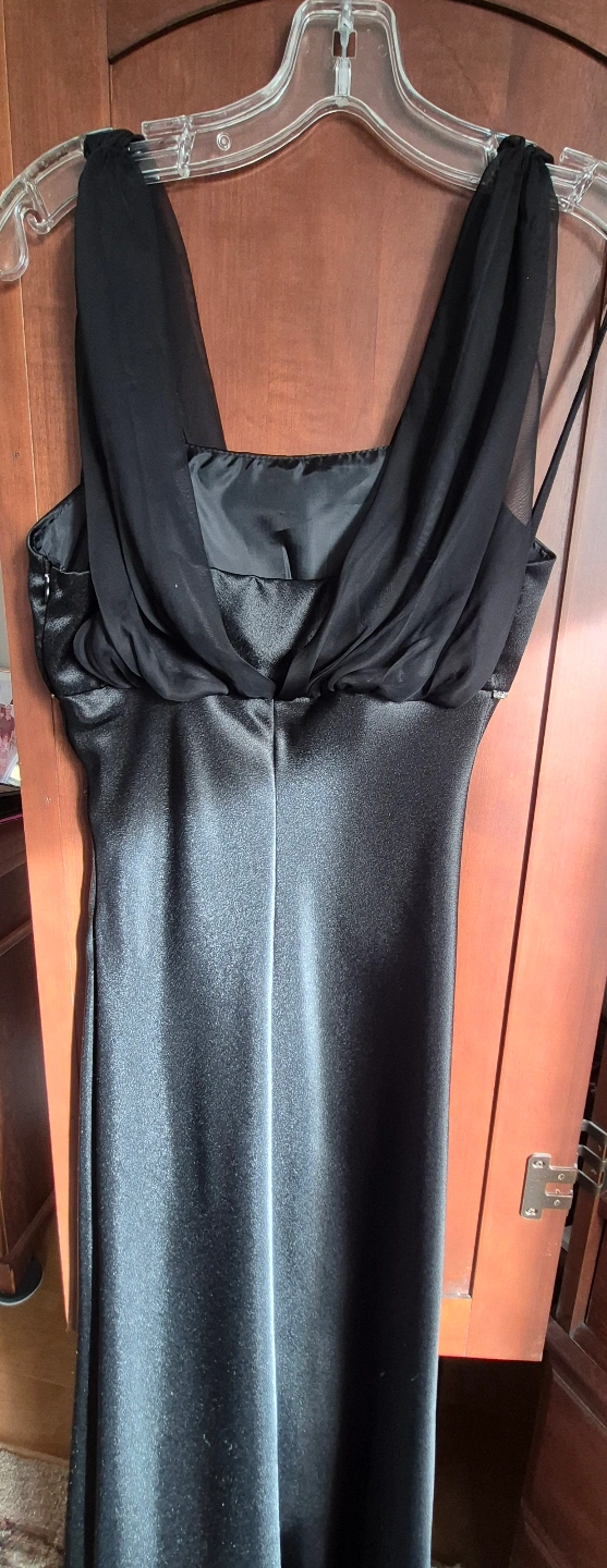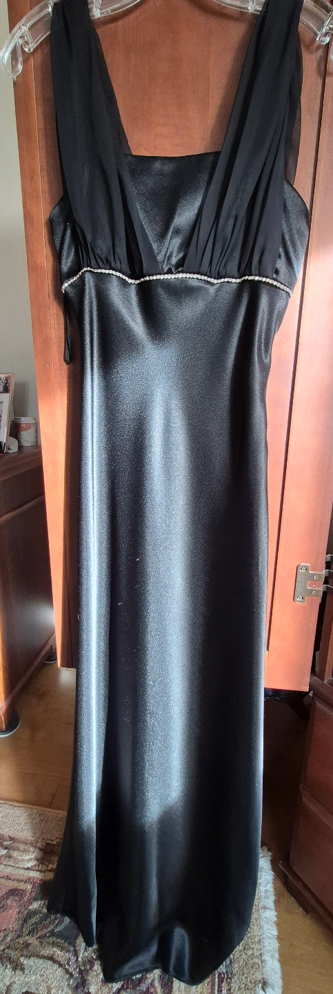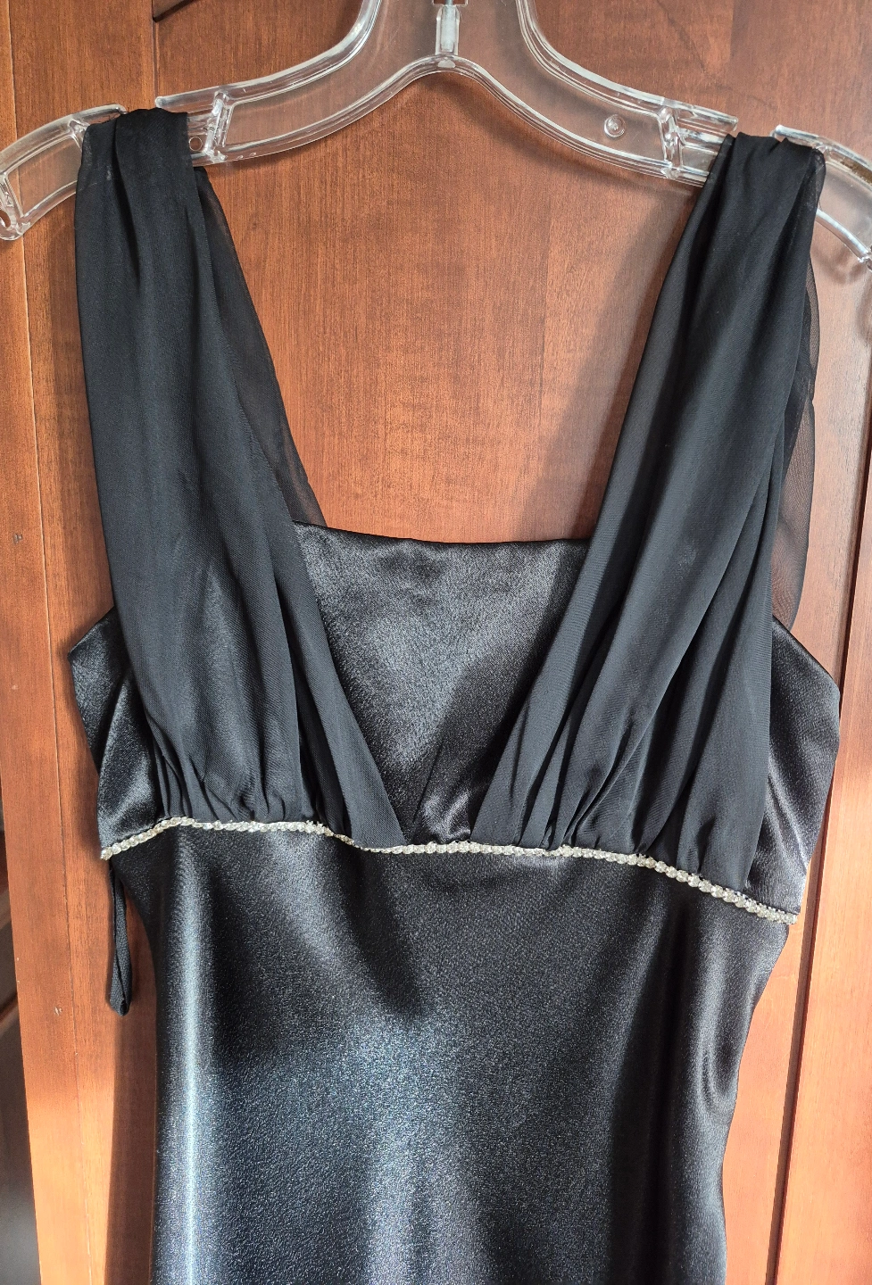 11Elegant black satin floor-length dress. Features a chiffon overlay at the neckline and thin straps. Embellished with a delicate beaded trim. Perfect for special occasions.