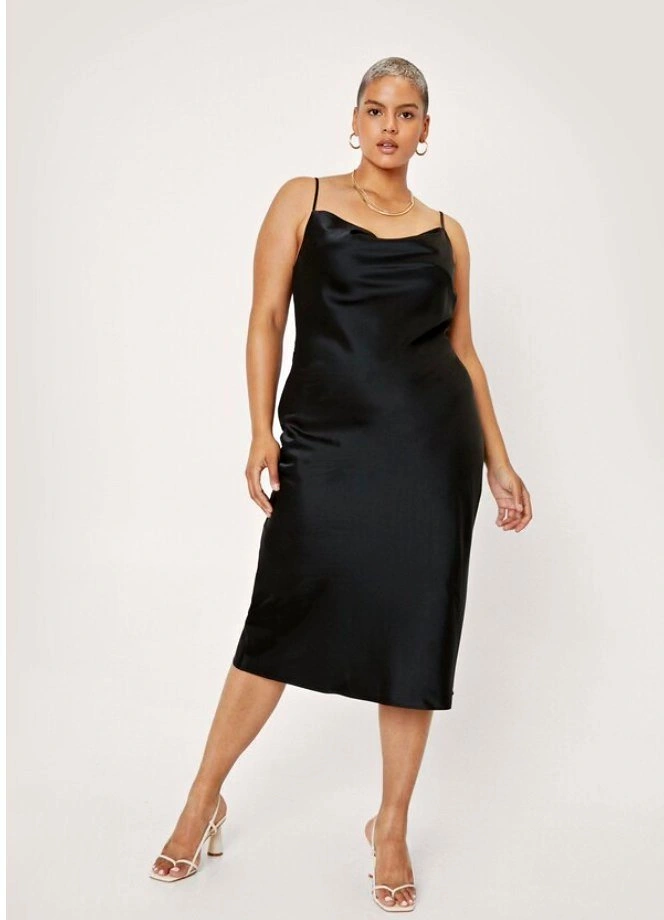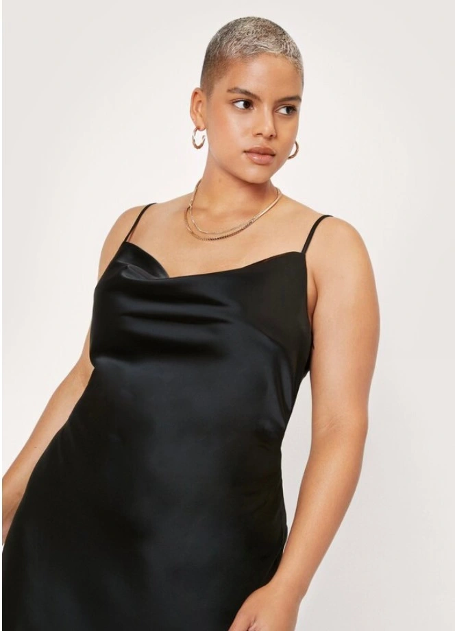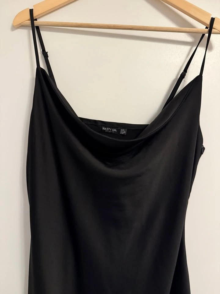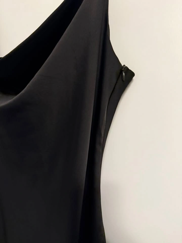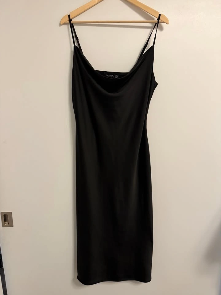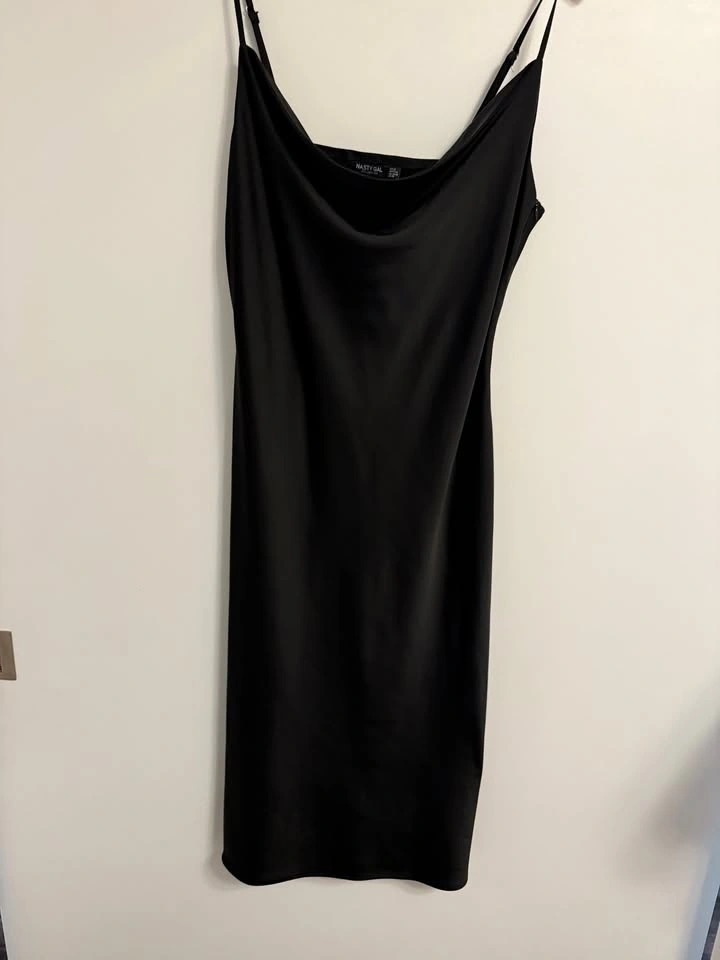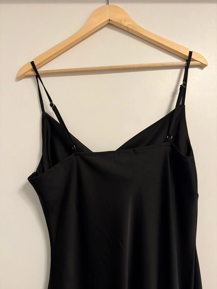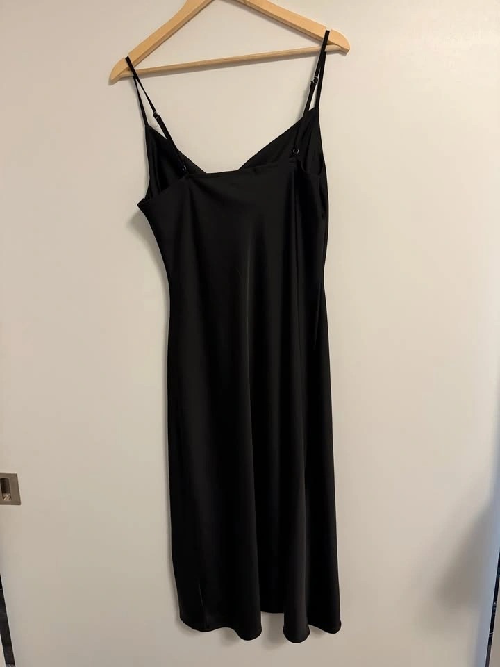 Classic black satin slip dress with a cowl neckline and adjustable straps. Elegant midi length that works for both casual outings and dressy occasions. Excellent condition. Size 12 $20. Pick Up Near Dufferin & Wilson (Wilson Subway Station).
