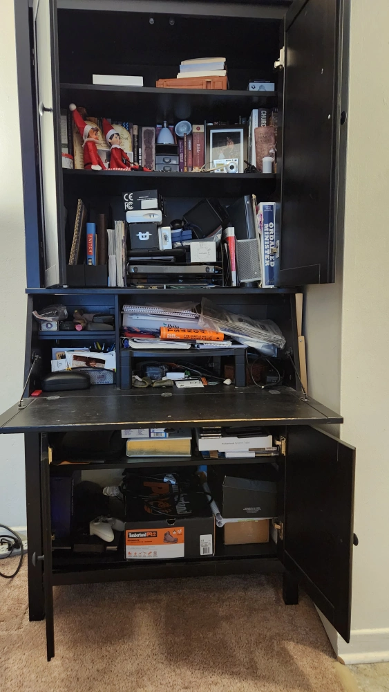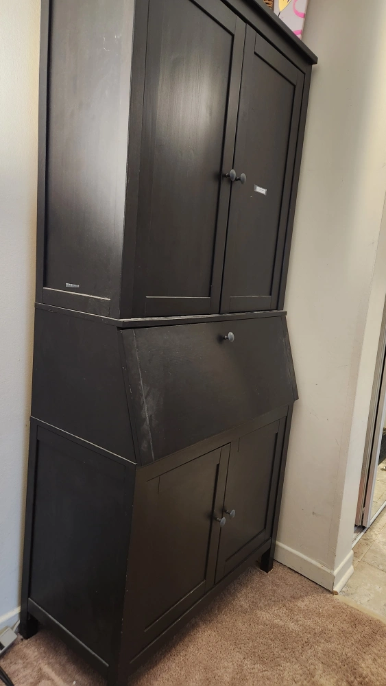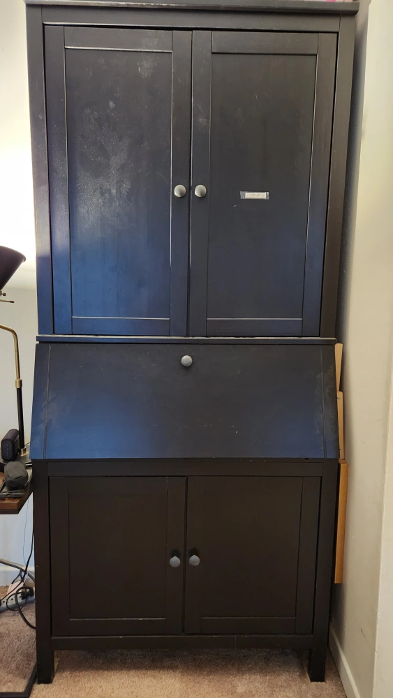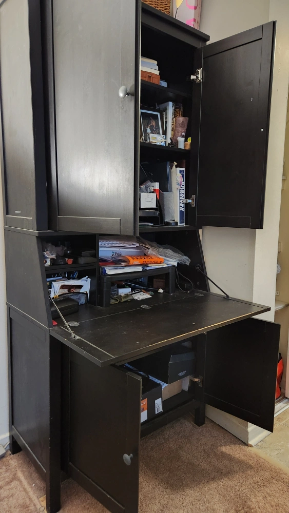 102Solid wood secretary desk. Features a hutch with shelving, a drop-down desk, and two lower cabinets. Ample storage. Great for home office or study. In very good condition. H77 x W35 x D18 Moving sale From a pet-free and smoke-free household. Only available for pickup