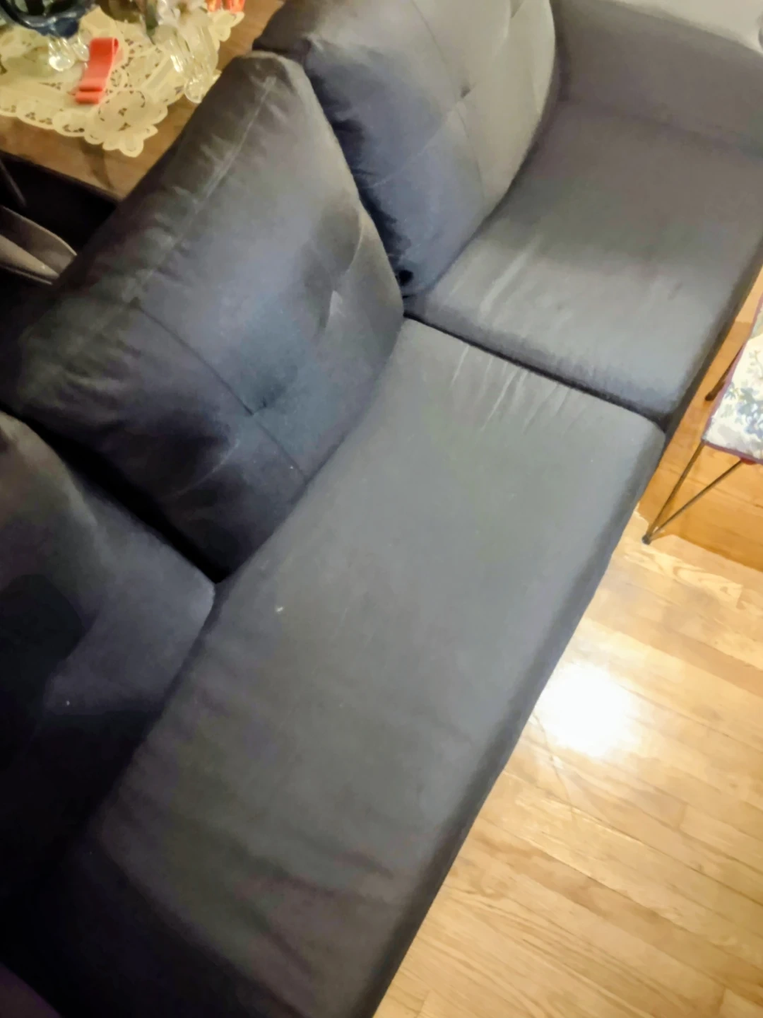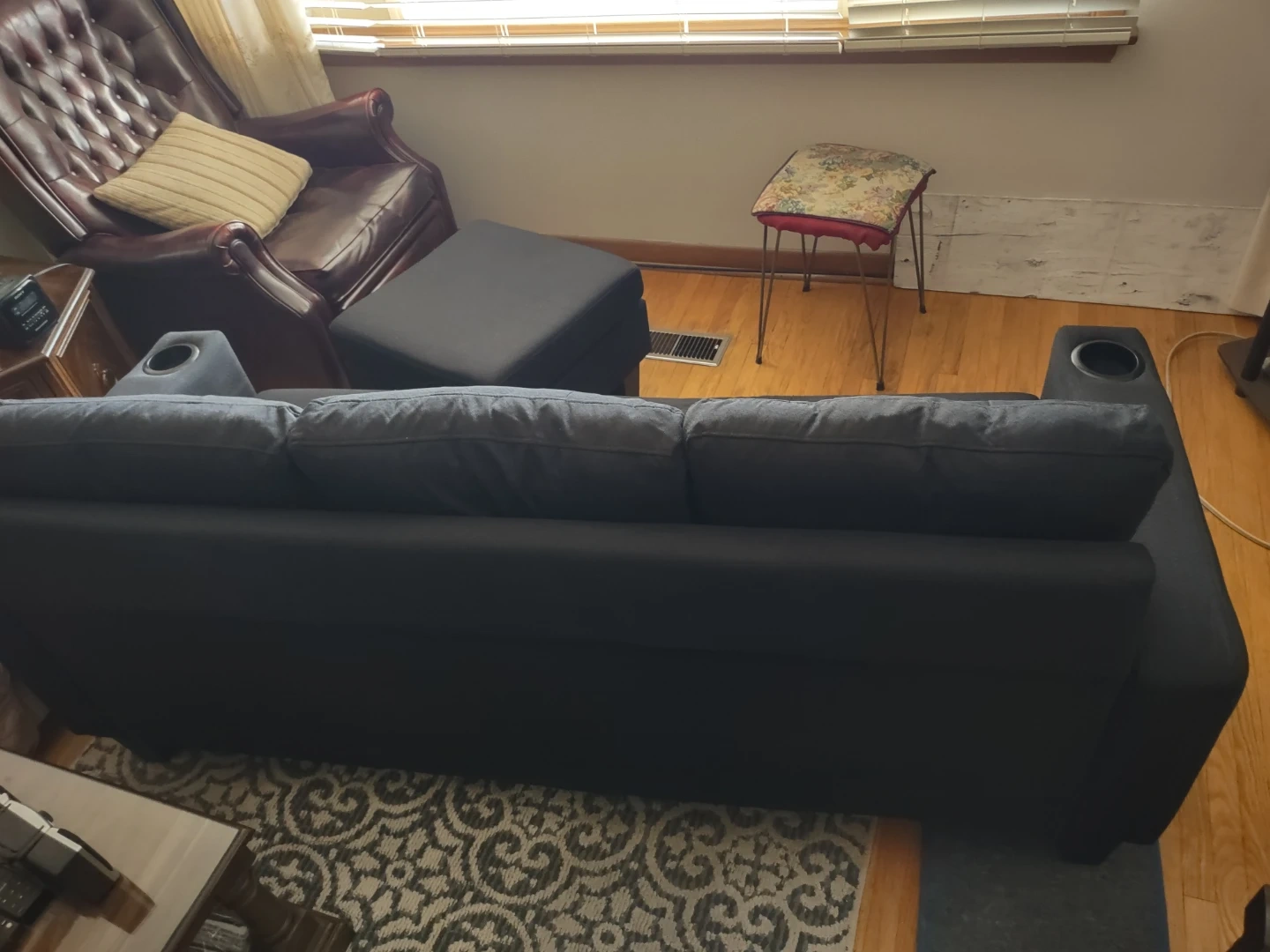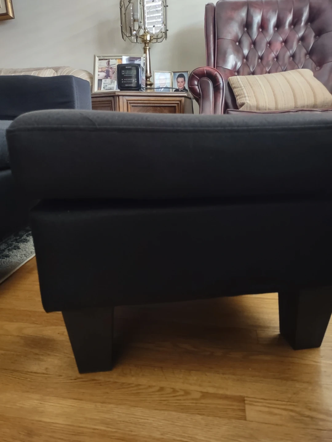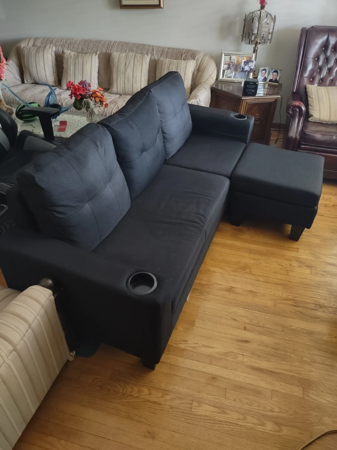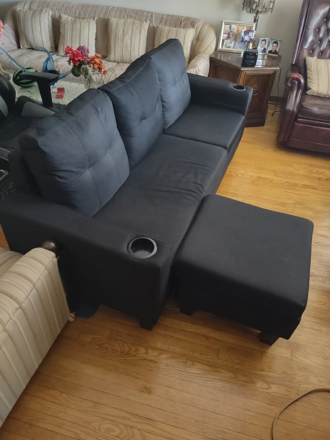 131Selling a comfy black sectional sofa! It comes with a matching ottoman, perfect for kicking back and relaxing after a long day. Great for smaller spaces or apartments. It's in good condition and ready for a new home! The cushions can be switched around so the ottoman can be fixed in one spot or movable . In very good condition Lightly used. No tears stains or scratches