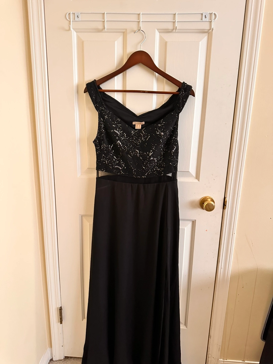Long black formal dress with sequins and mesh. Sleeveless with a scoop neck. Never worn