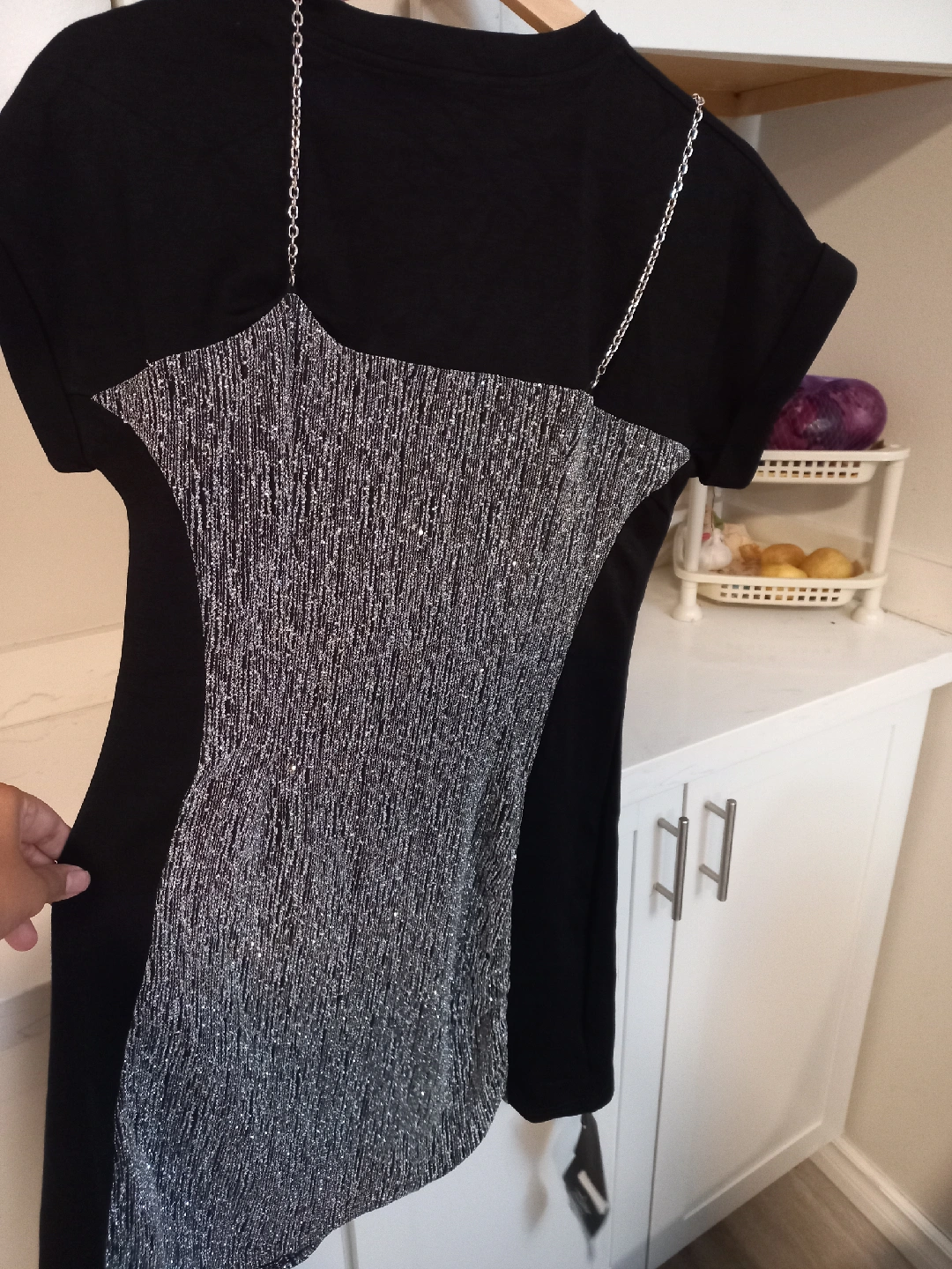 242Selling a cute party dress! It's black with a silver-patterned front and chain straps. Perfect for a night out! new dress with label. size -L please see my other listing.