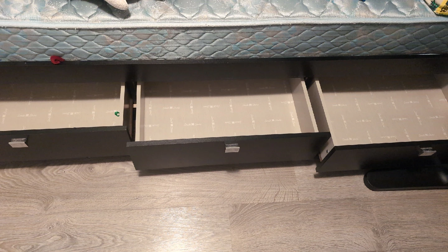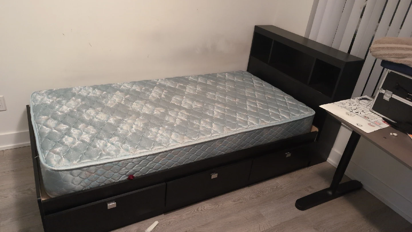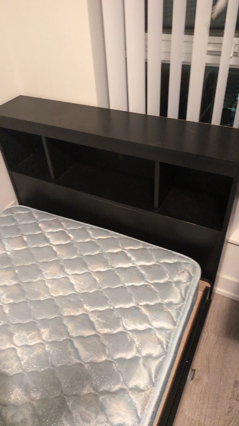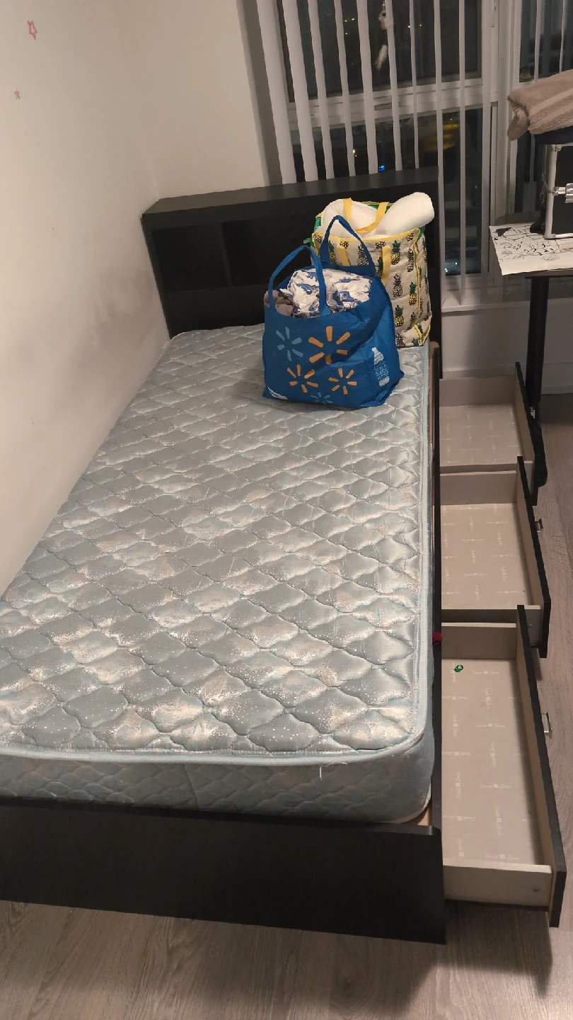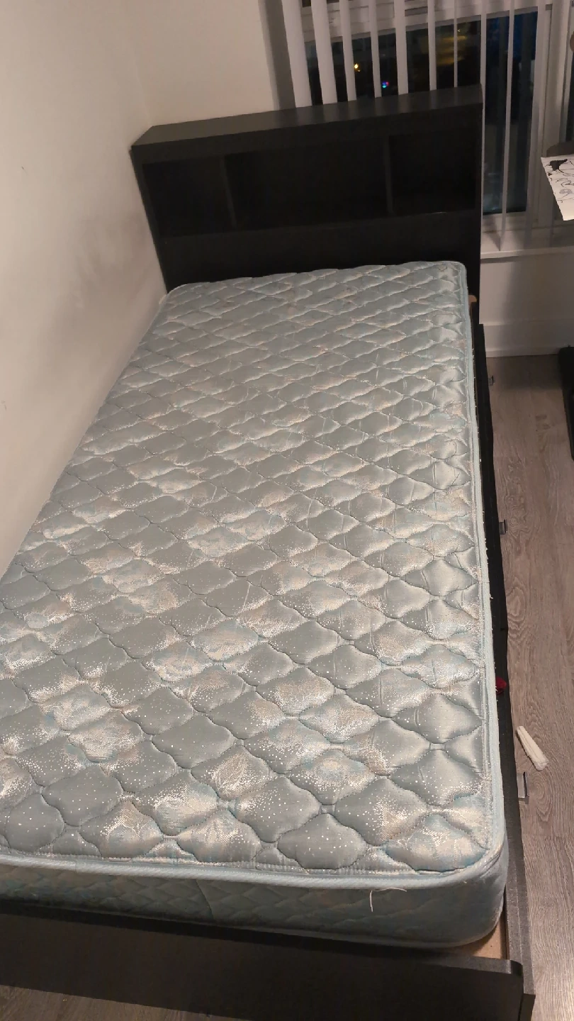 45Selling a single bed frame and mattress in dark brown! It comes with a storage headboard with multiple shelves, perfect for books or decor. The bed also has three spacious drawers underneath for extra storage. It is in good condition and ready for a new home. two sets of sheets and mattress protector included. moving sale. almost new. pick up ASAP.