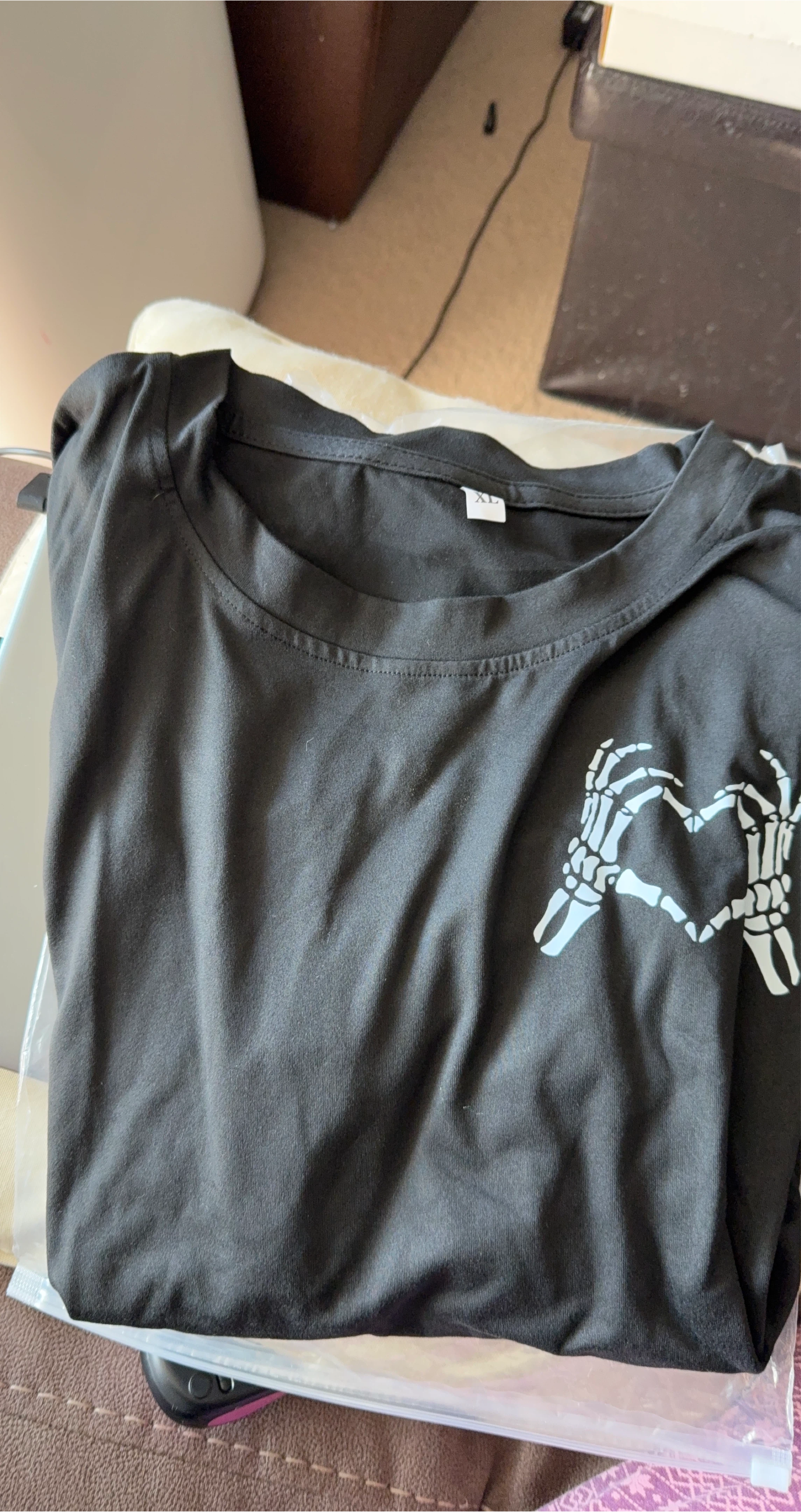 15Selling a black T-shirt with a skeleton heart design, size XL! It's in great condition and ready for a new home. Never been worn.