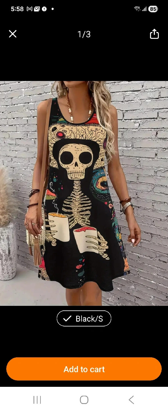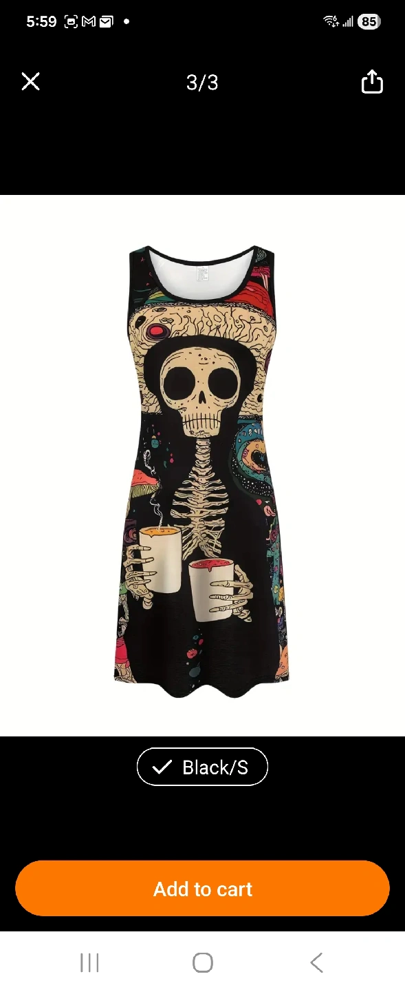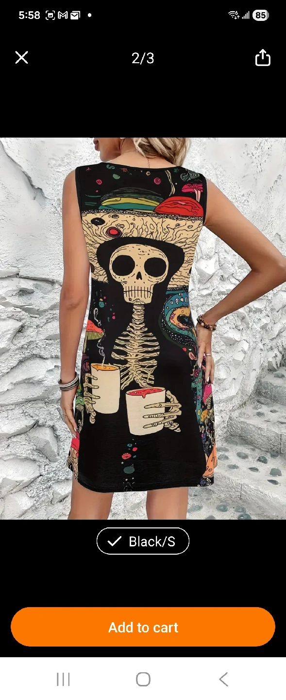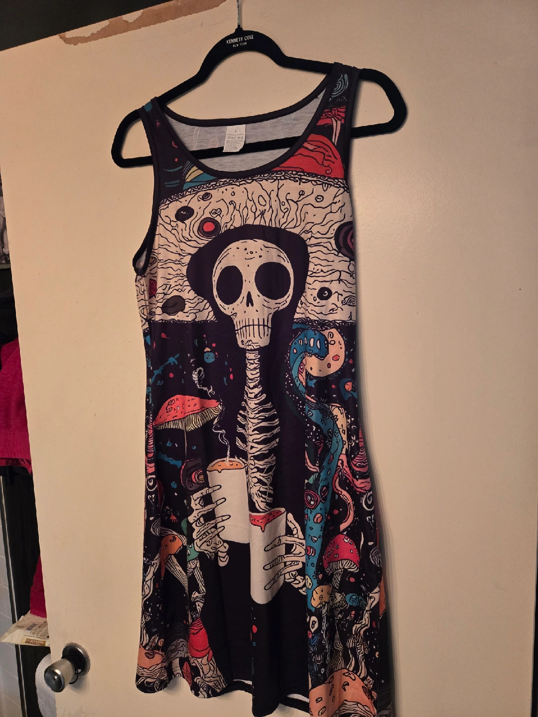 Cute black dress with a fun skeleton print! It's a size small and in great condition. Perfect for adding a bit of spooky style to your wardrobe!
