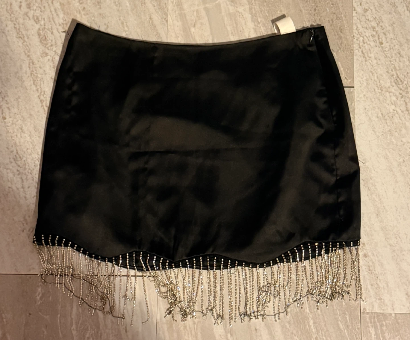 Selling a stylish black skirt with a fun fringe detail! It's in great condition and ready for a new home. Perfect for a night out or a special occasion