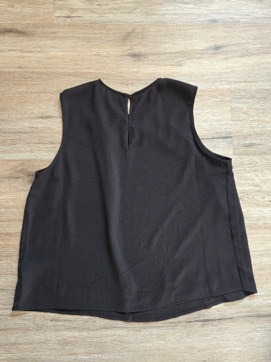 10Here's a simple black sleeveless blouse! It's in great condition and ready for a new home. The material feels nice and light, perfect for warmer weather. It has a small opening in the back with a button closure.