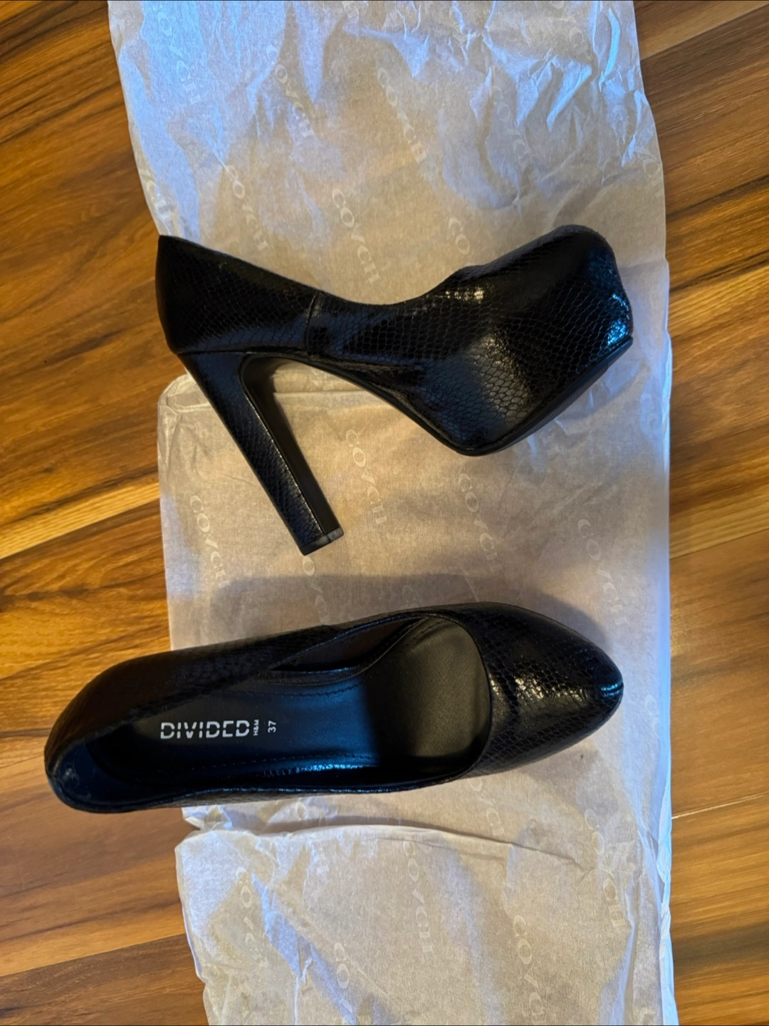 201Pair of brand new black platform heels. Snakeskin print. 5-inch heel.