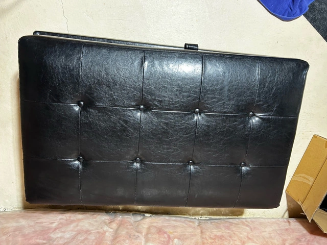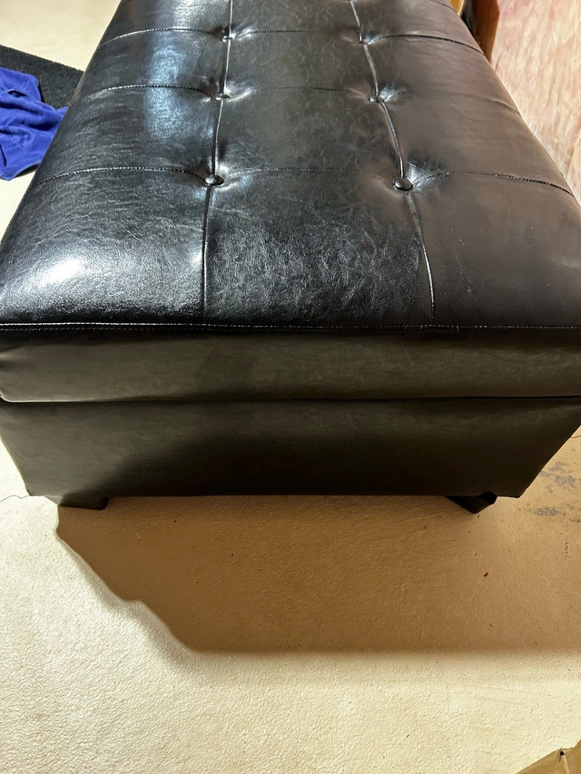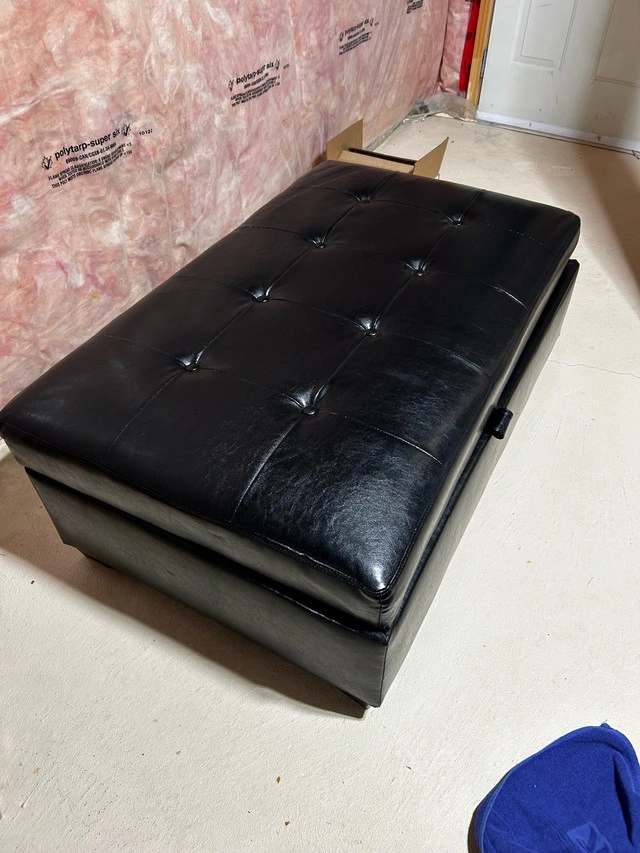 This used black faux leather storage ottoman is perfect for adding seating and storage to any room. The ottoman features a tufted top and a spacious interior for storing blankets, pillows, or other items. There is no damage or rips. Excellent condition. Size 46”w x 16 ”h x 28” d. Paid over $500. * Material: Faux leather * Colour: Black * Features: Storage * Style: Tufted