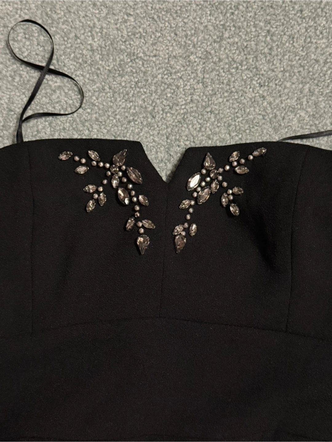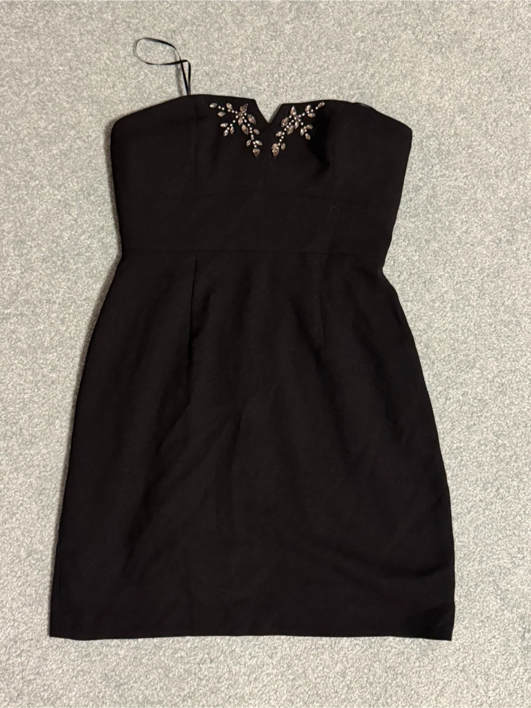 Selling a cute black strapless mini dress! It features a jeweled detail on the front. Perfect for a night out or special occasion!