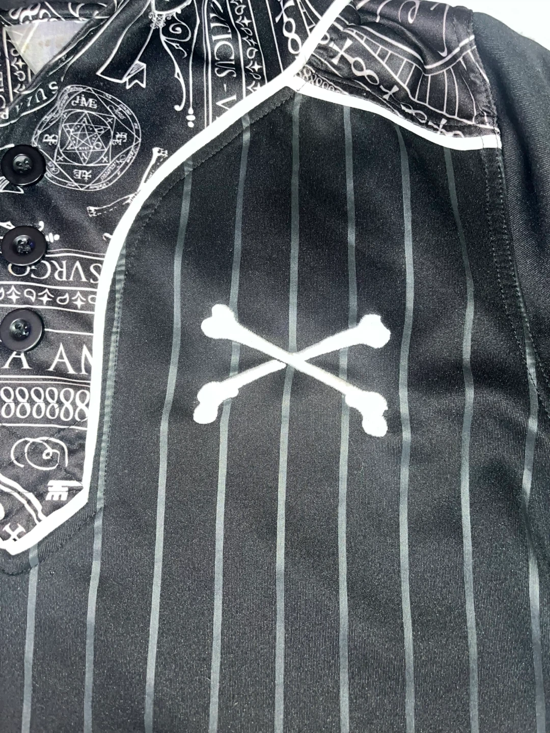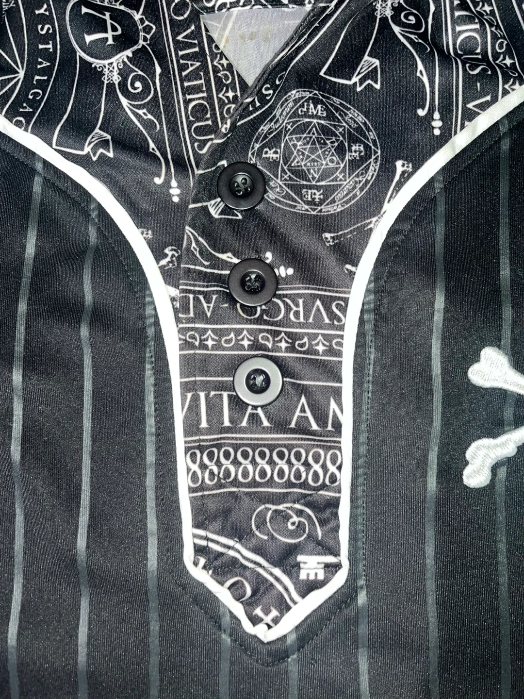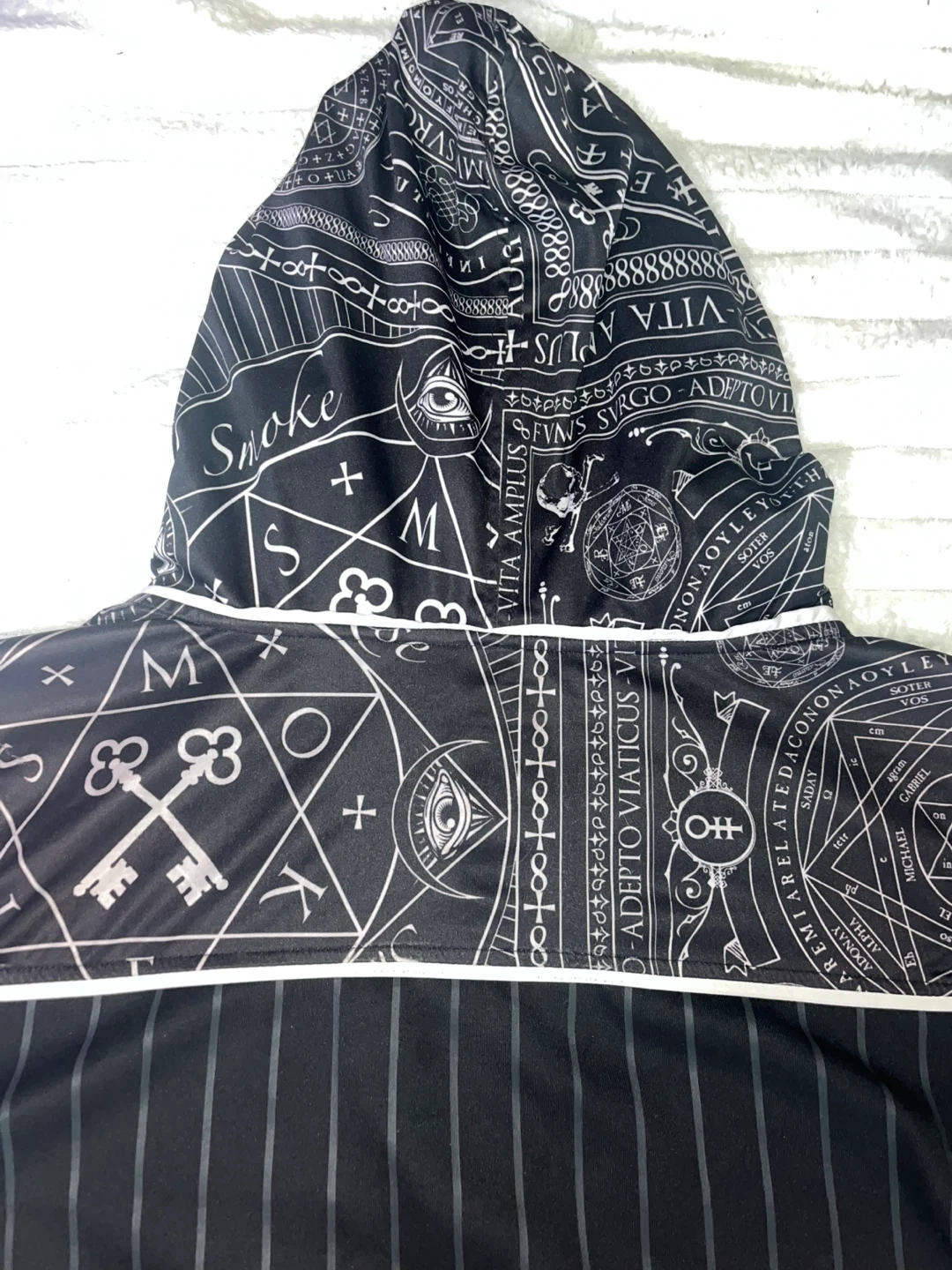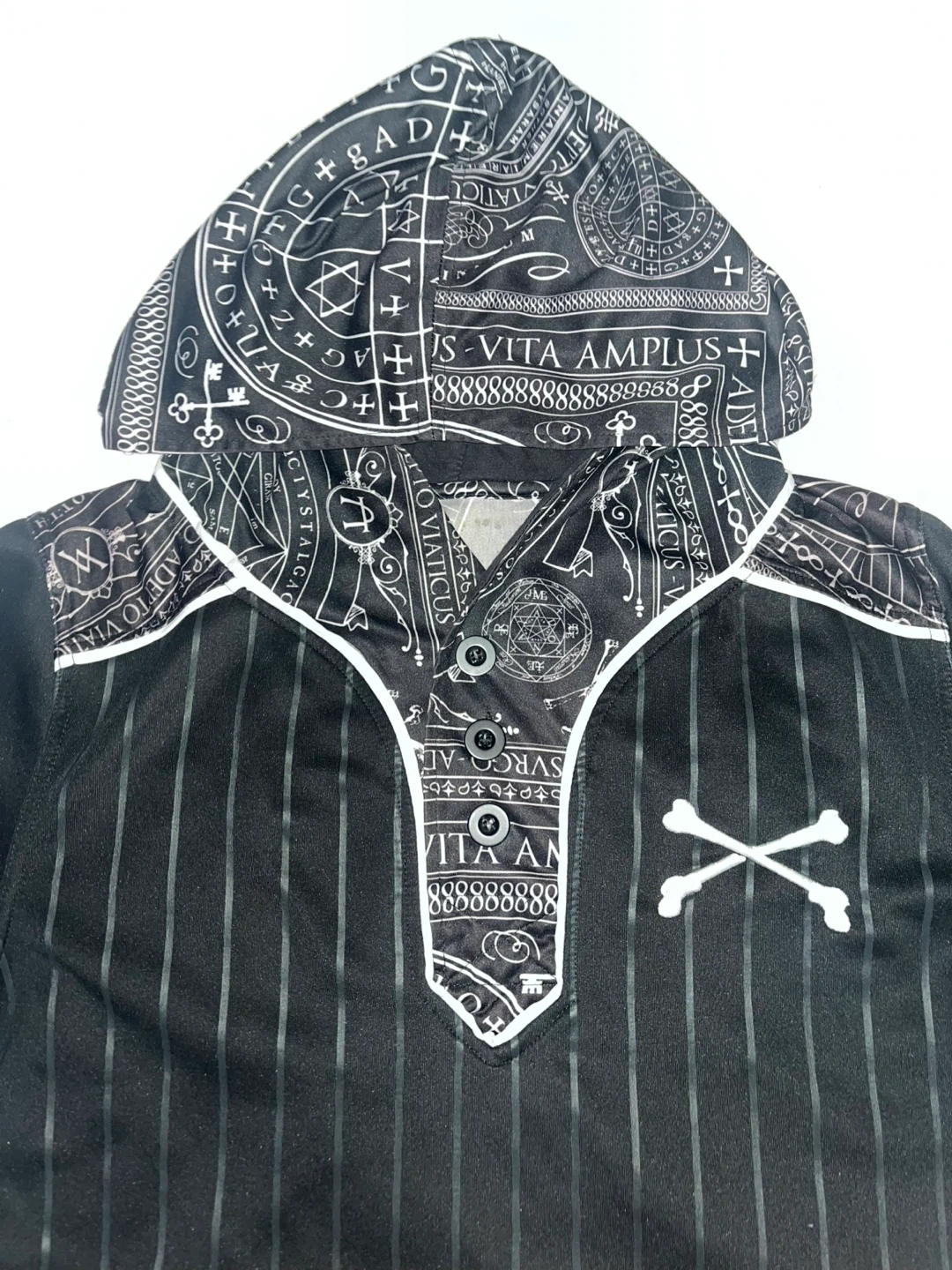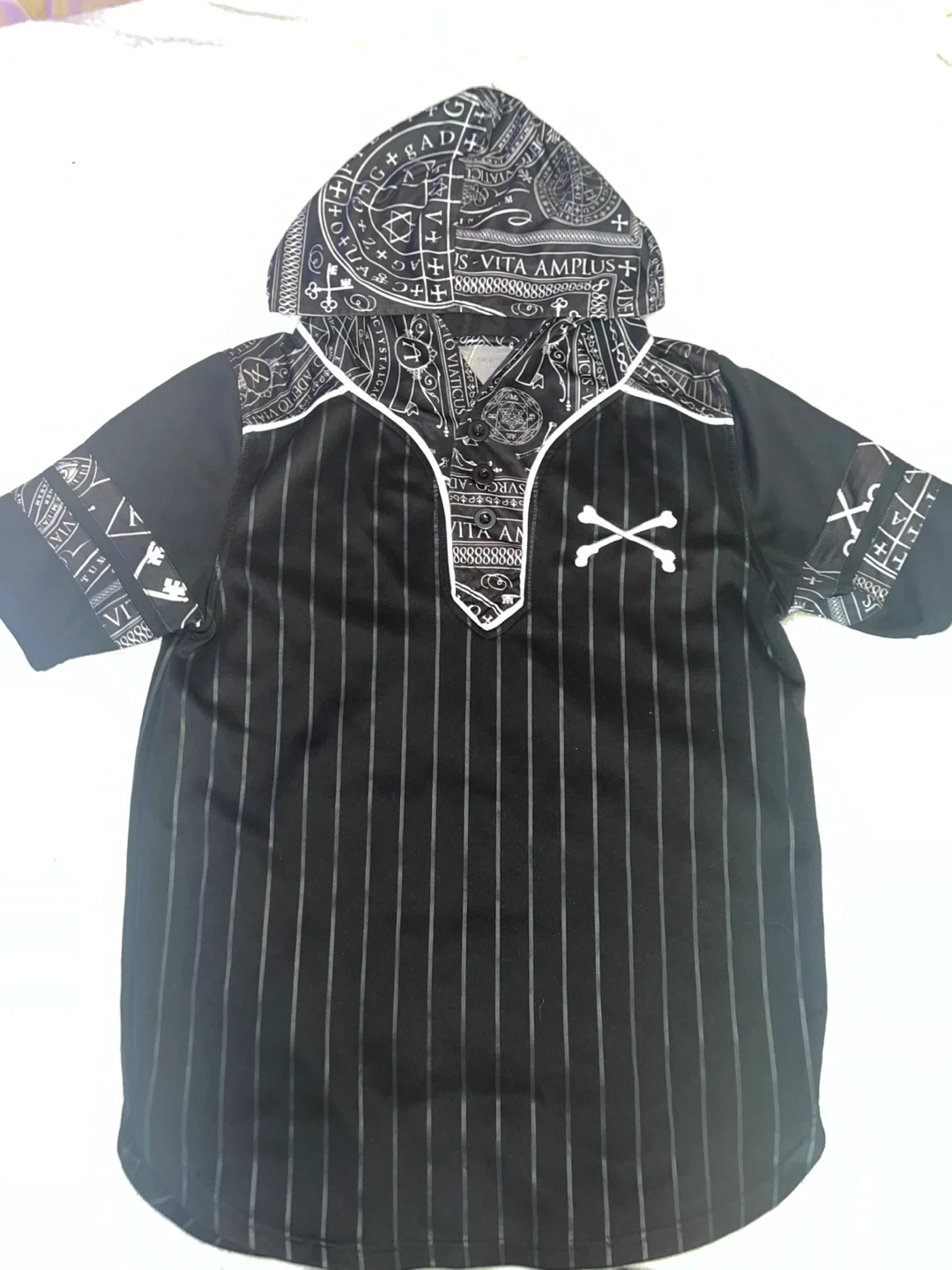 101Here's a cool black hoodie shirt with a unique graphic design! It features white stripes and various symbols and patterns. The shirt has a hood and short sleeves, perfect for a casual look.