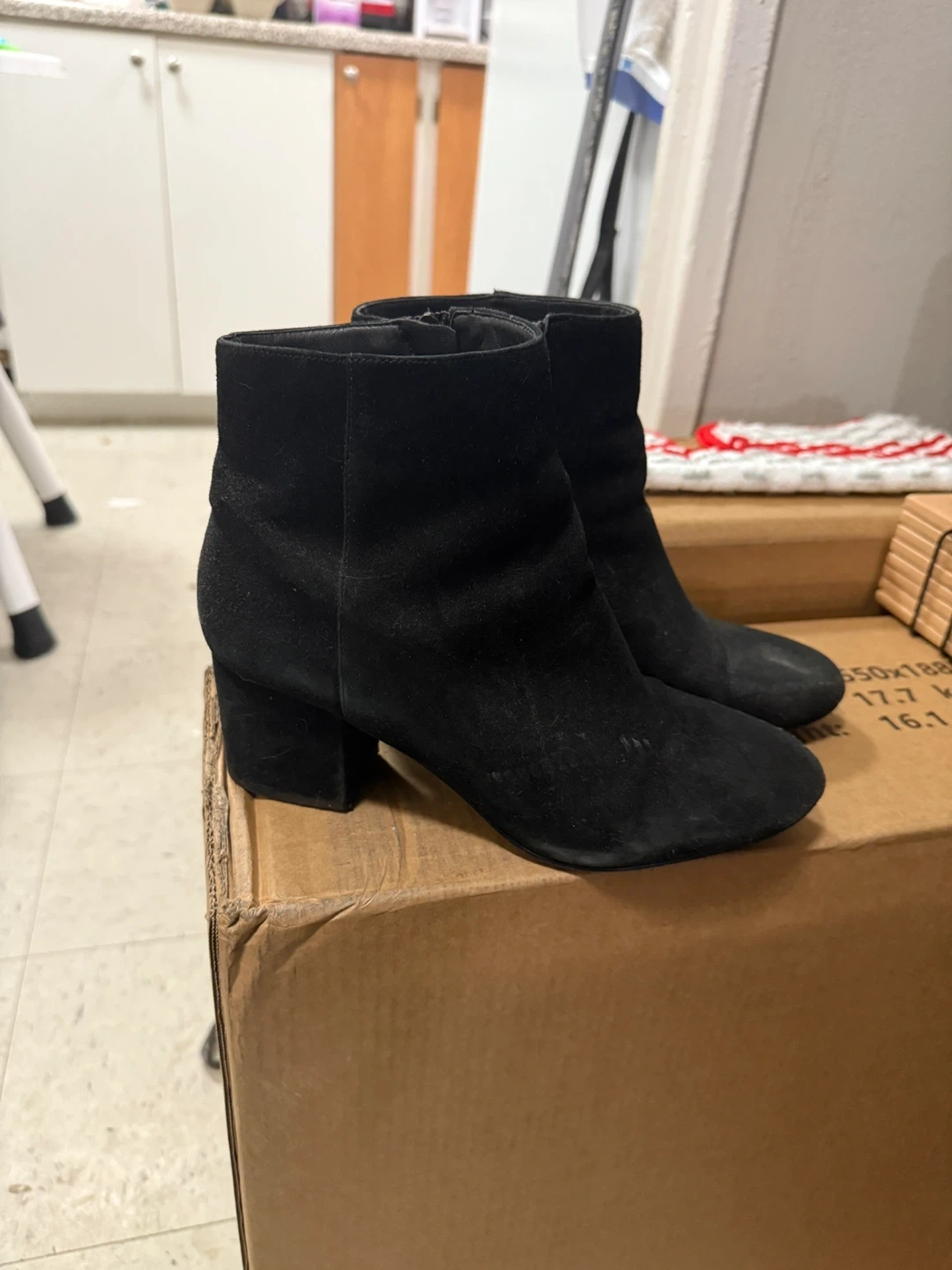 Selling a pair of black suede ankle boots. They're in good condition and ready for a new home! Perfect for adding a touch of style to any outfit. They are a women's size.
