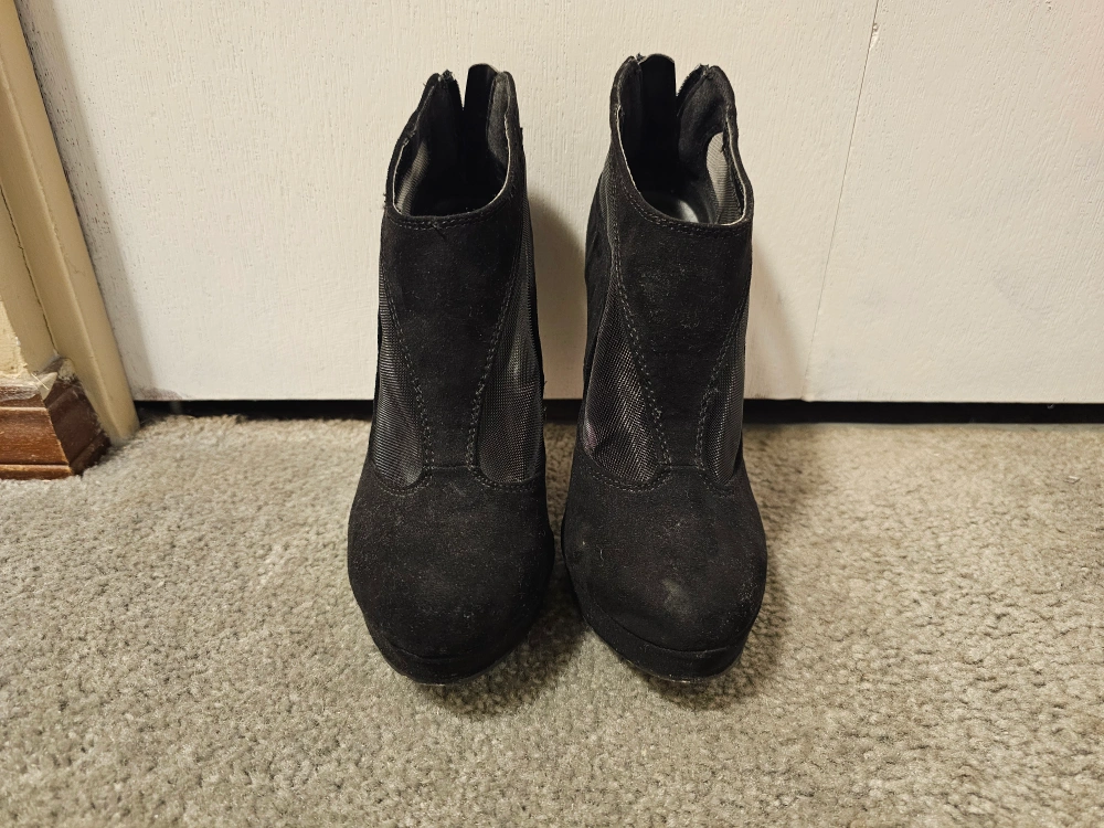 10Black suede ankle boots with mesh detail and high heels. Back zipper closure. size 6