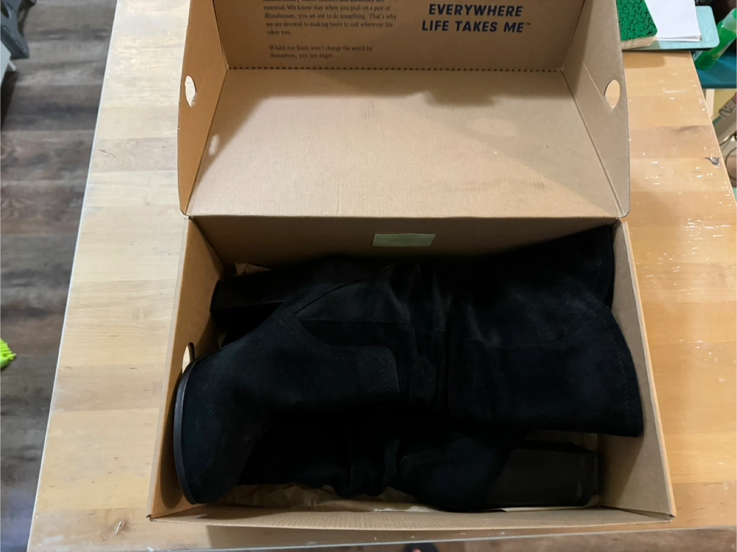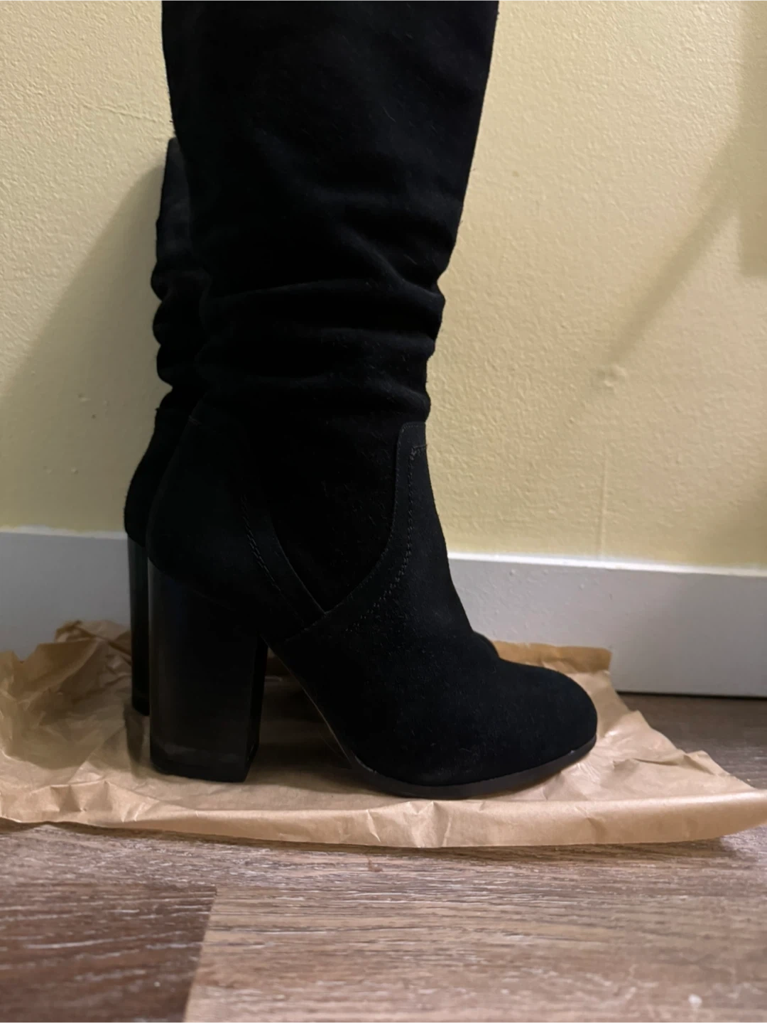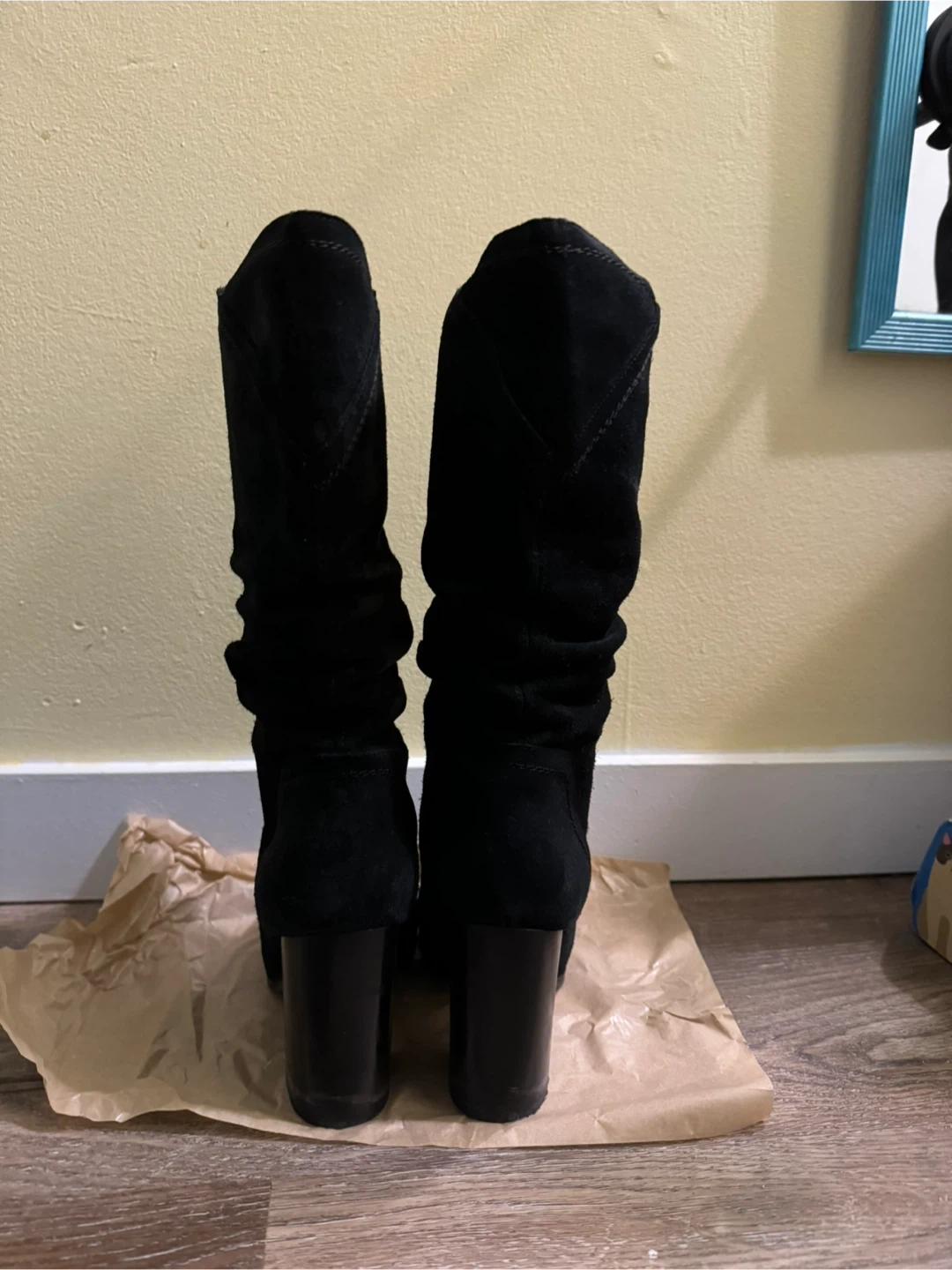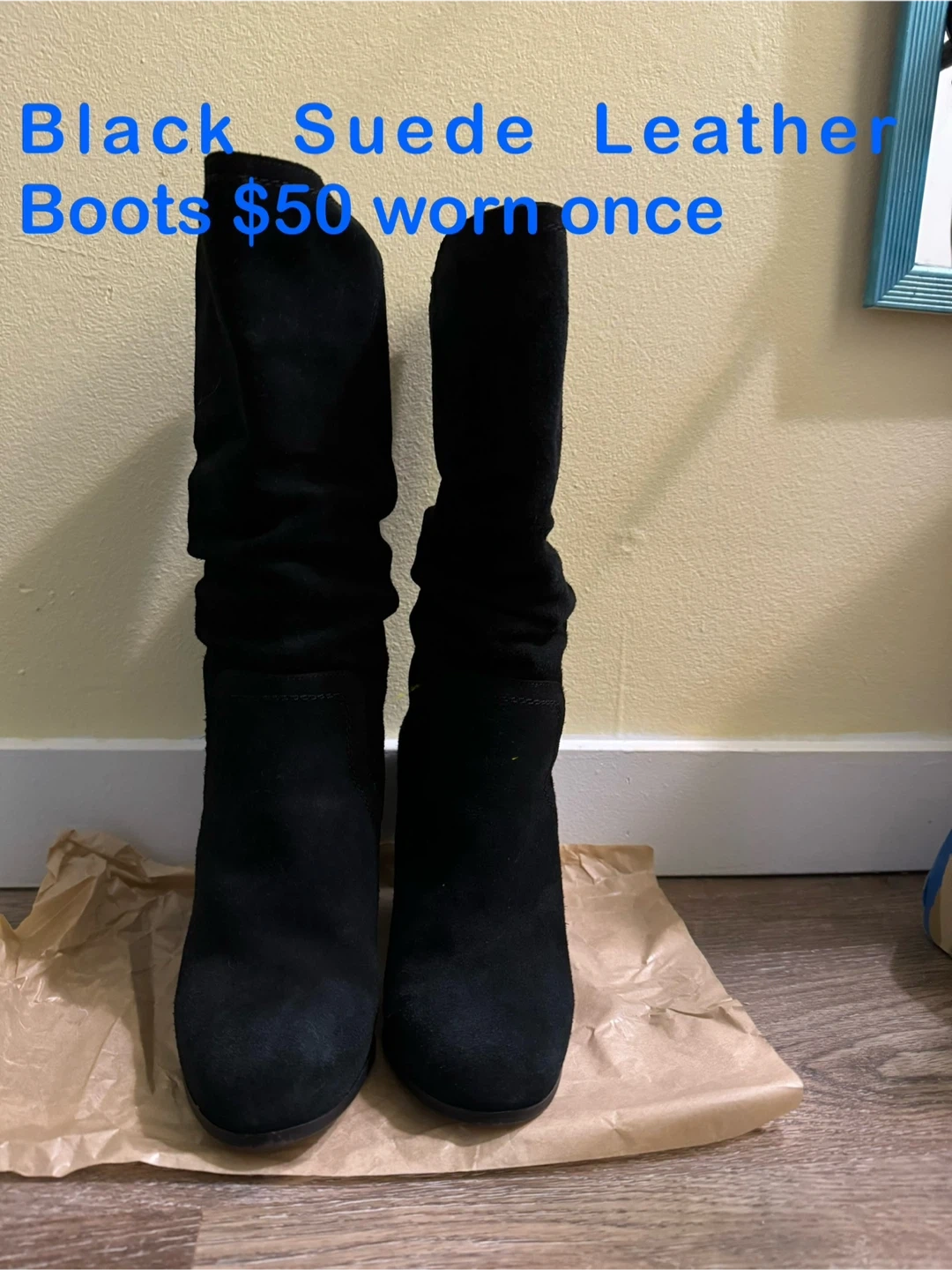 Selling a pair of black suede leather boots. They have been worn only once and are in excellent condition. Comes with box!