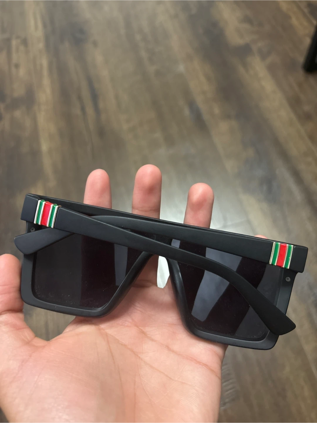 12Selling a pair of black sunglasses. They have a stylish green and red stripe detail on the sides. Great condition!