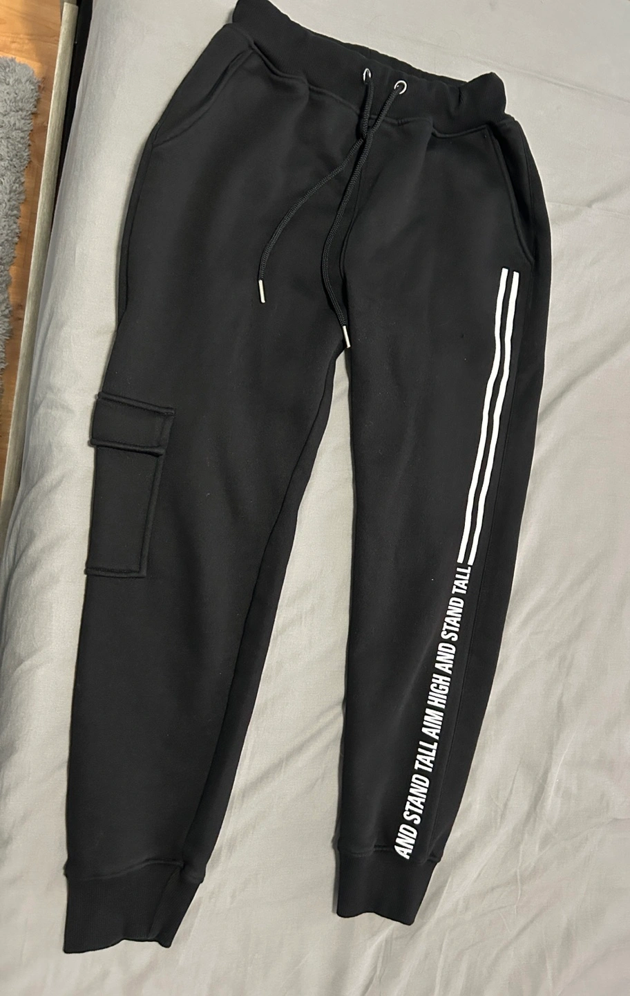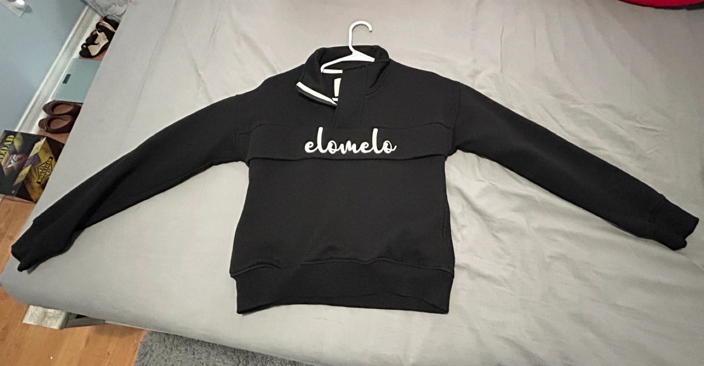 Women's black sweatshirt and joggers set. Half-zip sweatshirt features embroidered logo. Joggers have side stripes and cargo pocket. Great for lounging or working out.