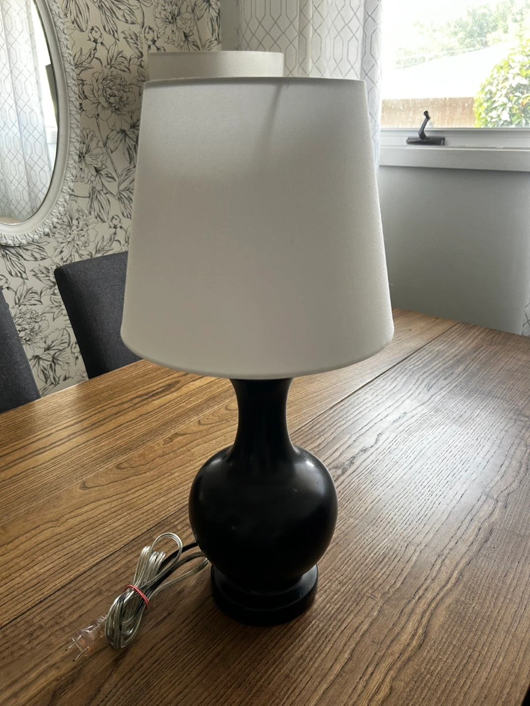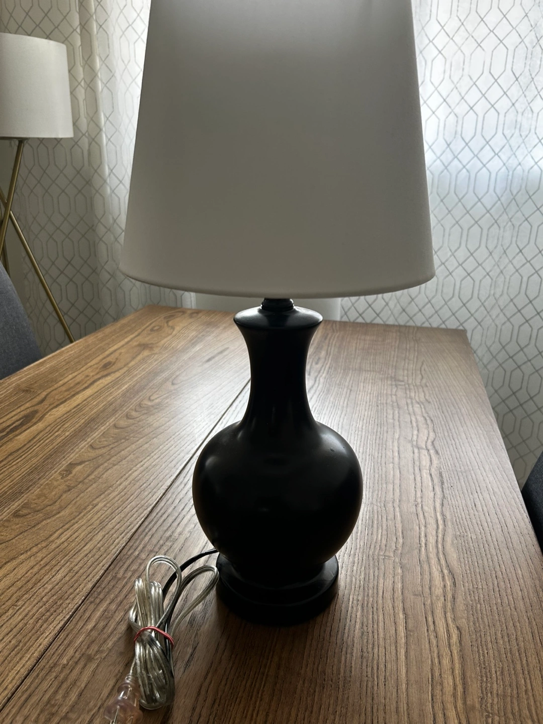 Selling a lovely black table lamp with a white shade. It's in great condition and would look perfect on a bedside table or desk. The lamp has a classic design that will complement any decor. It's ready to light up your space! NO HOLDS , CASH ONLY