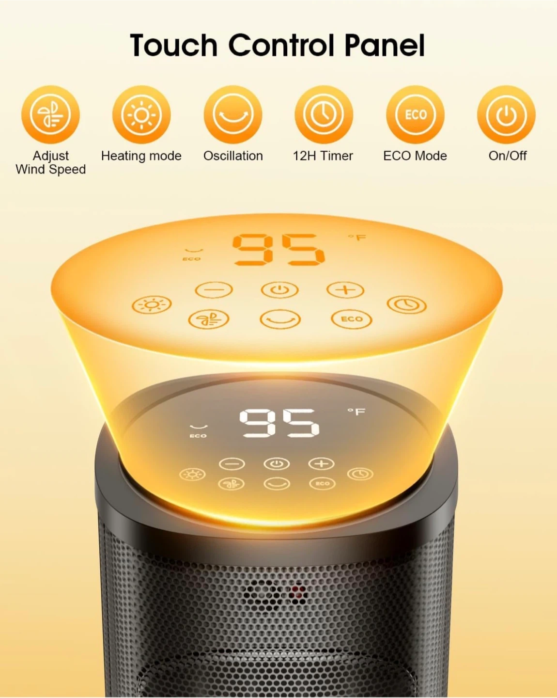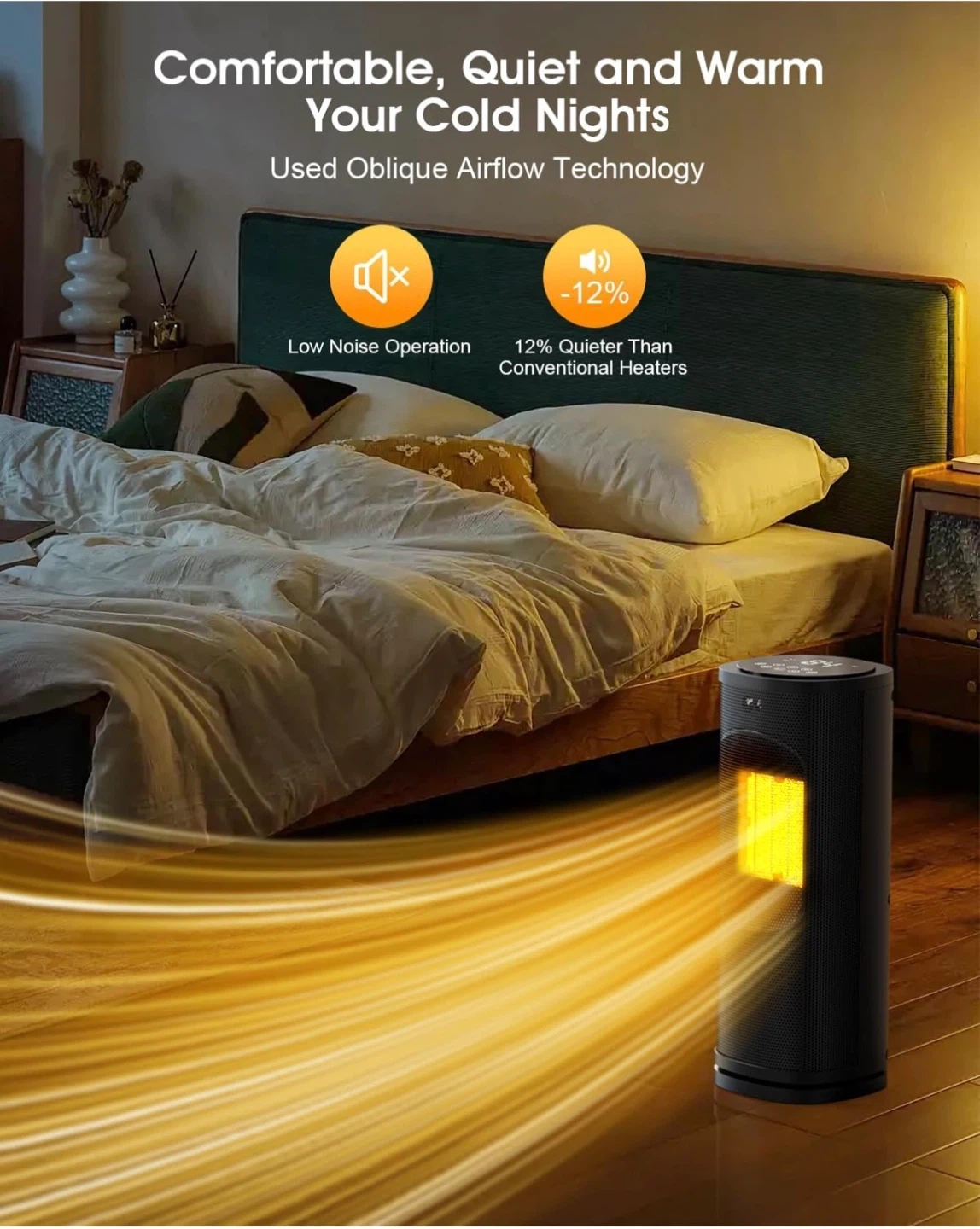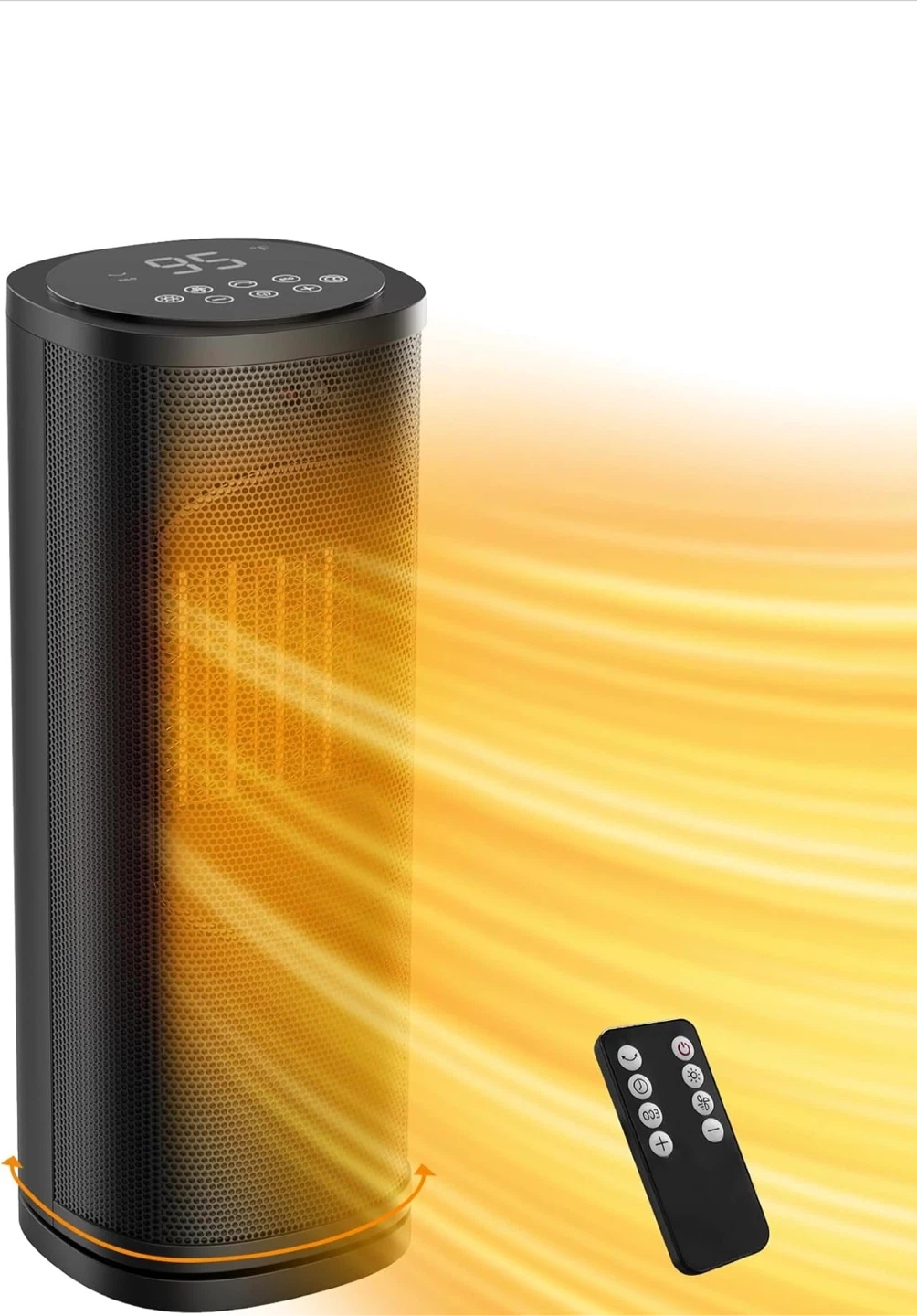 10This is a black tower space heater that's super quiet! It uses oblique airflow technology and is 12% quieter than conventional heaters. It also has multi-layer safety protection, including overheat and tip-over protection. The touch control panel lets you adjust wind speed, heating mode, oscillation, set a 12-hour timer, and use ECO mode. It also comes with a remote