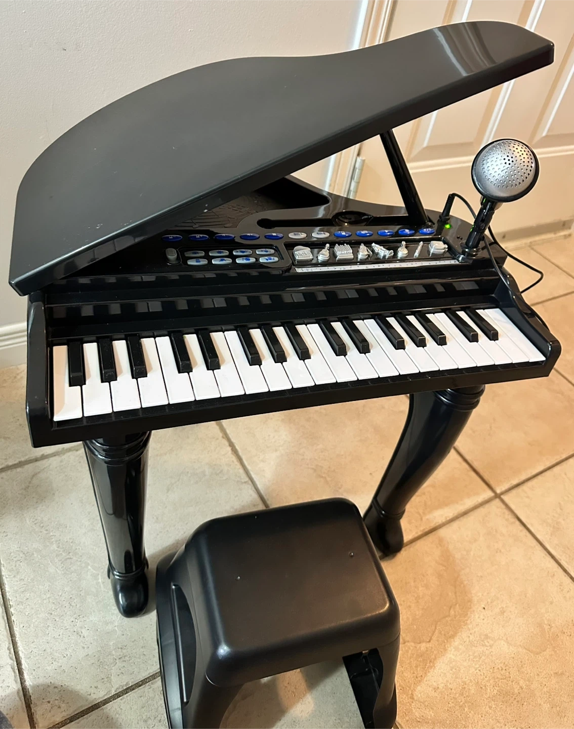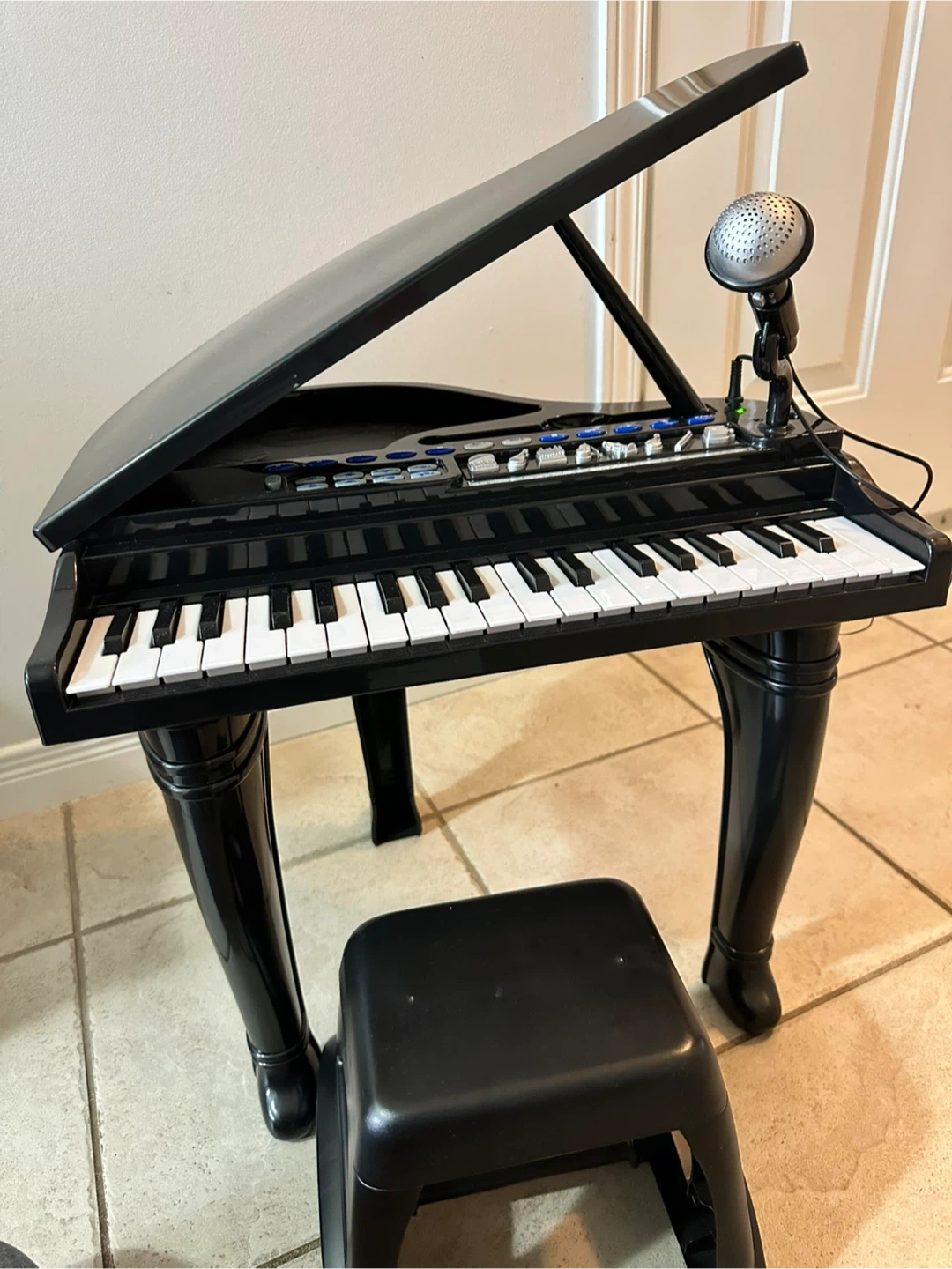 Selling a black toy grand piano, perfect for budding musicians! It comes with a microphone, so your little one can sing along while they play. Includes a matching stool so they can sit comfortably. Hours of fun for kids!
