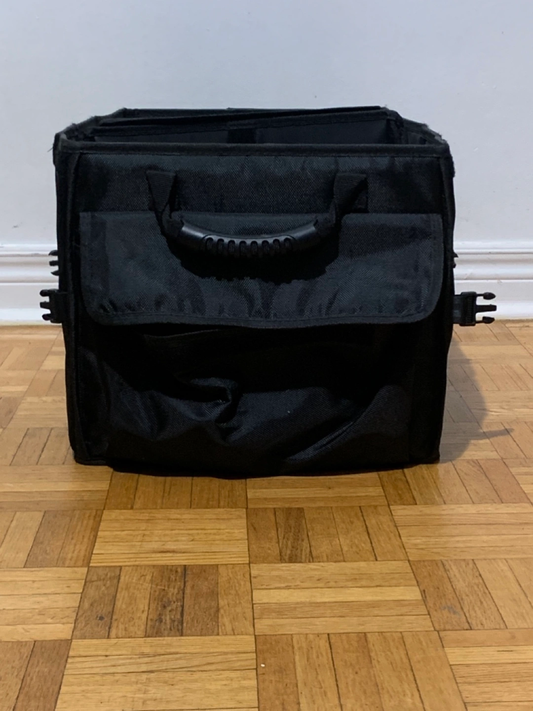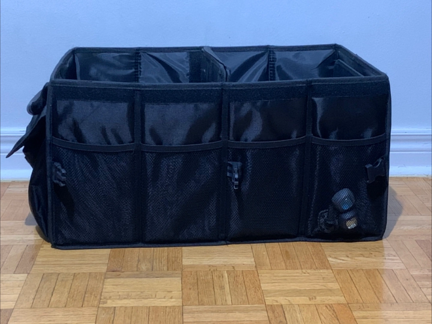 Here's a black trunk organizer to keep your car tidy! It has multiple compartments and pockets for easy storage and organization. Perfect for groceries, sports equipment, or emergency supplies