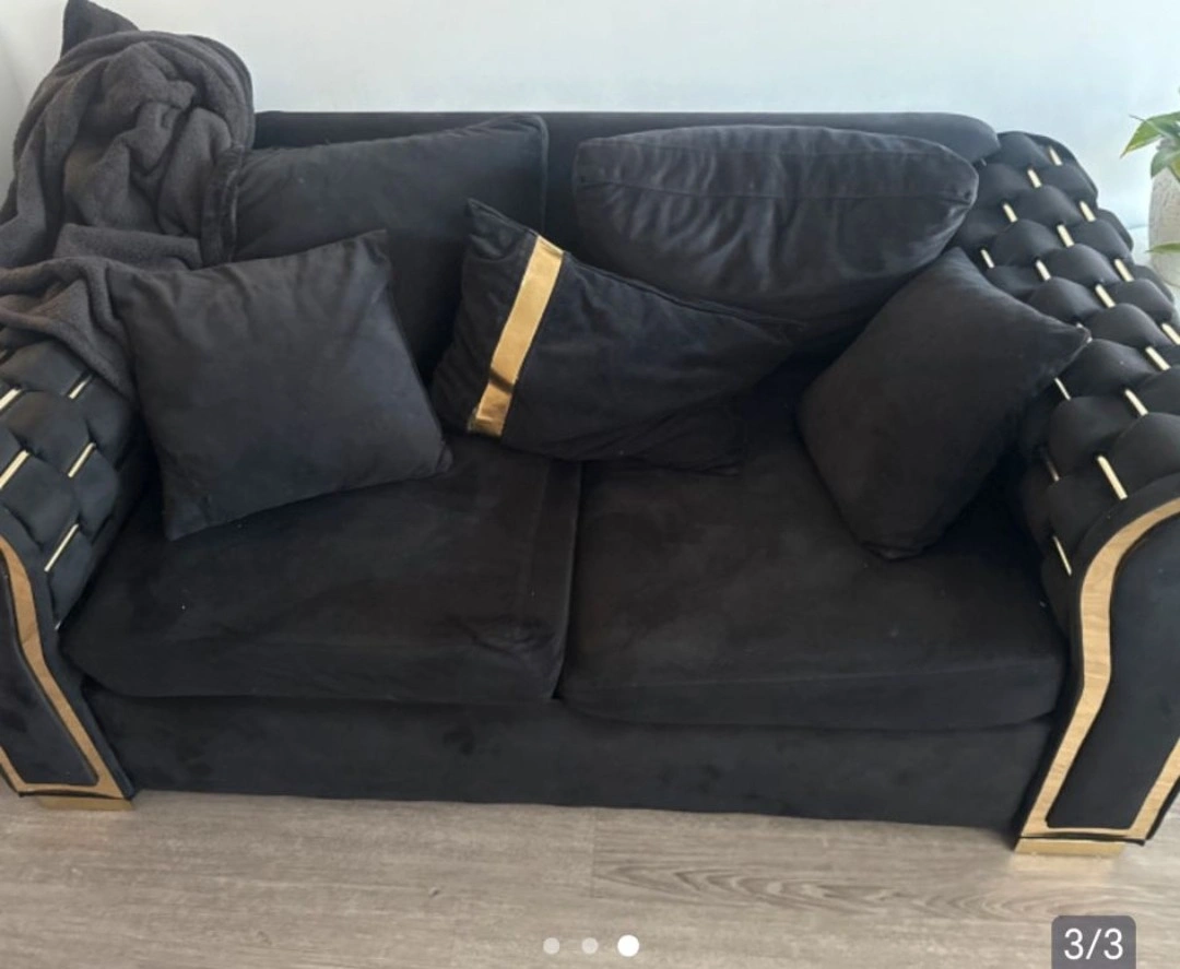 10Selling a stylish black sofa with tufted detailing and elegant gold trim. It comes with several cushions as pictured. The sofa is in good condition and would be a great addition to any living room sofa and two chairs included
