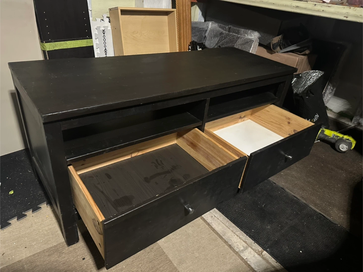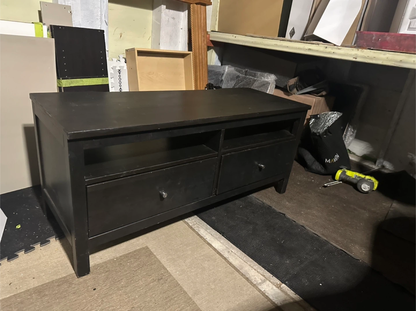 Selling a black TV stand in good condition. It has two drawers and an open shelf for storage. Perfect for organizing your media devices and accessories! Width 49 inches Depth 19 inches Height 22 inches