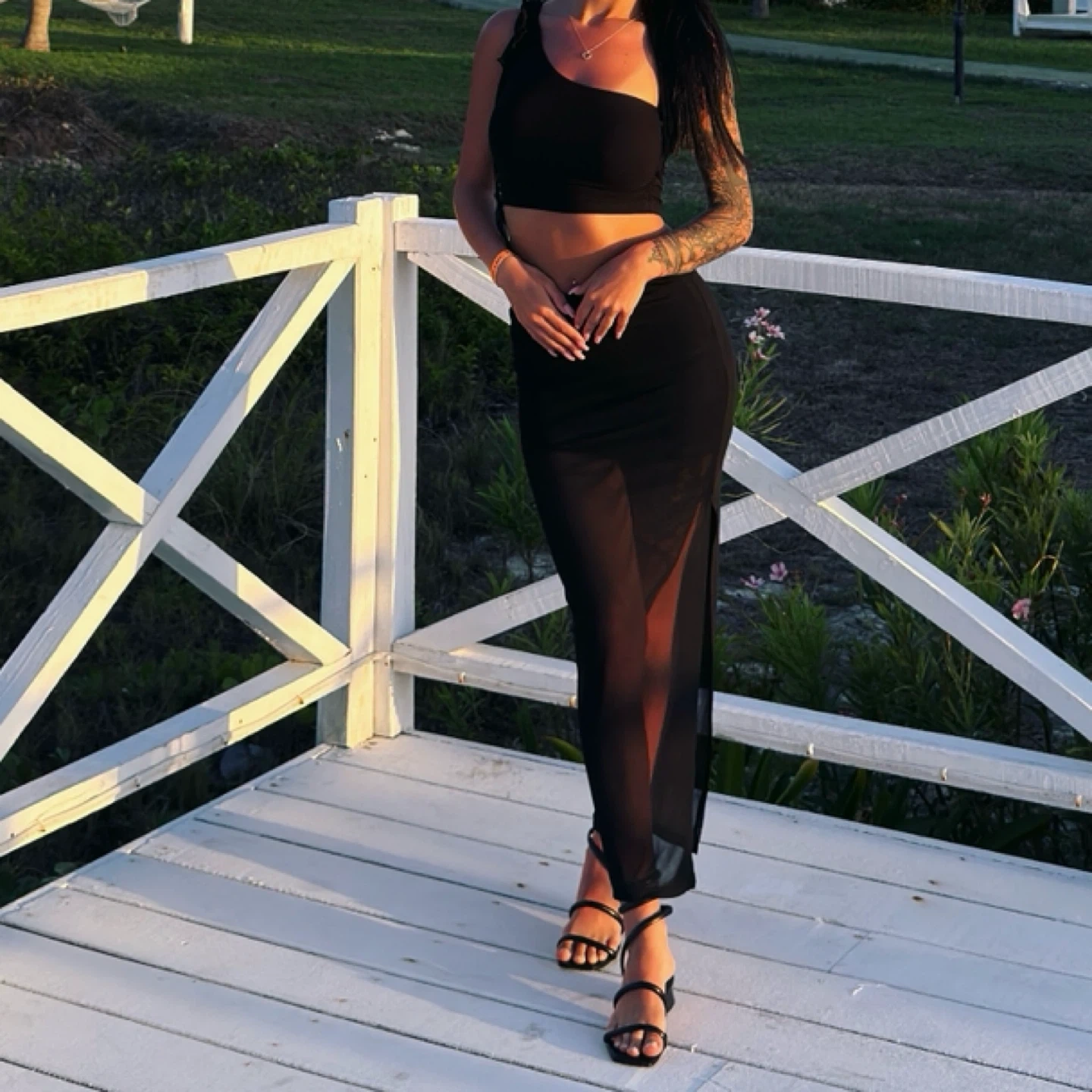 10This is a stylish black two-piece set. It includes a one-shoulder crop top and a matching maxi skirt with a sheer panel. Perfect for a night out or a summer event!