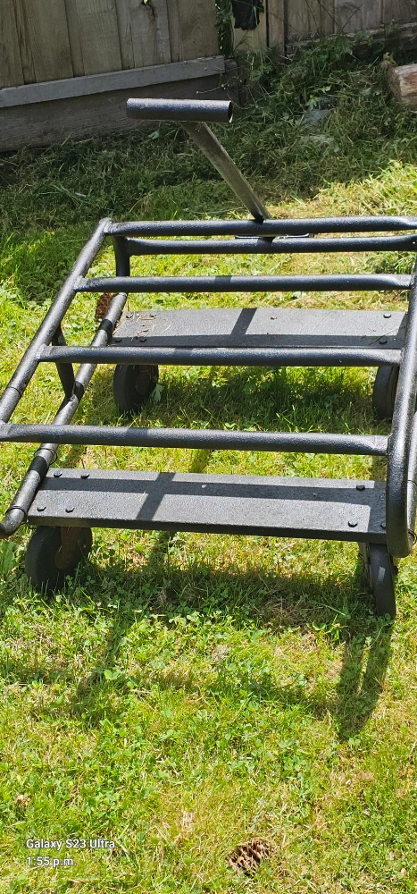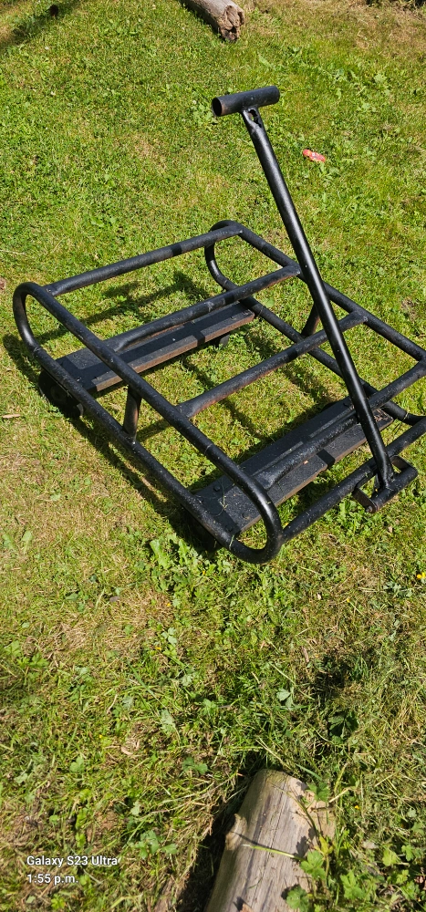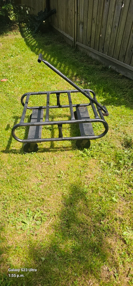 Selling a antique black utility wagon cart. It's in good condition and ready to help you move things around your yard or garden. It has a handle for easy pulling and sturdy wheels to navigate various terrains. Perfect for gardening, hauling equipment, or any other tasks where you need a reliable cart! only used for flower basket display