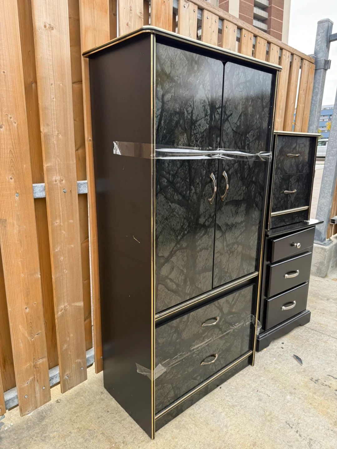 10Selling a wardrobe and dresser set. The wardrobe features a cabinet with doors and a bottom drawer. The dresser set includes a three-drawer unit and a smaller three-drawer unit that can be stacked on top. Perfect for adding storage to any room