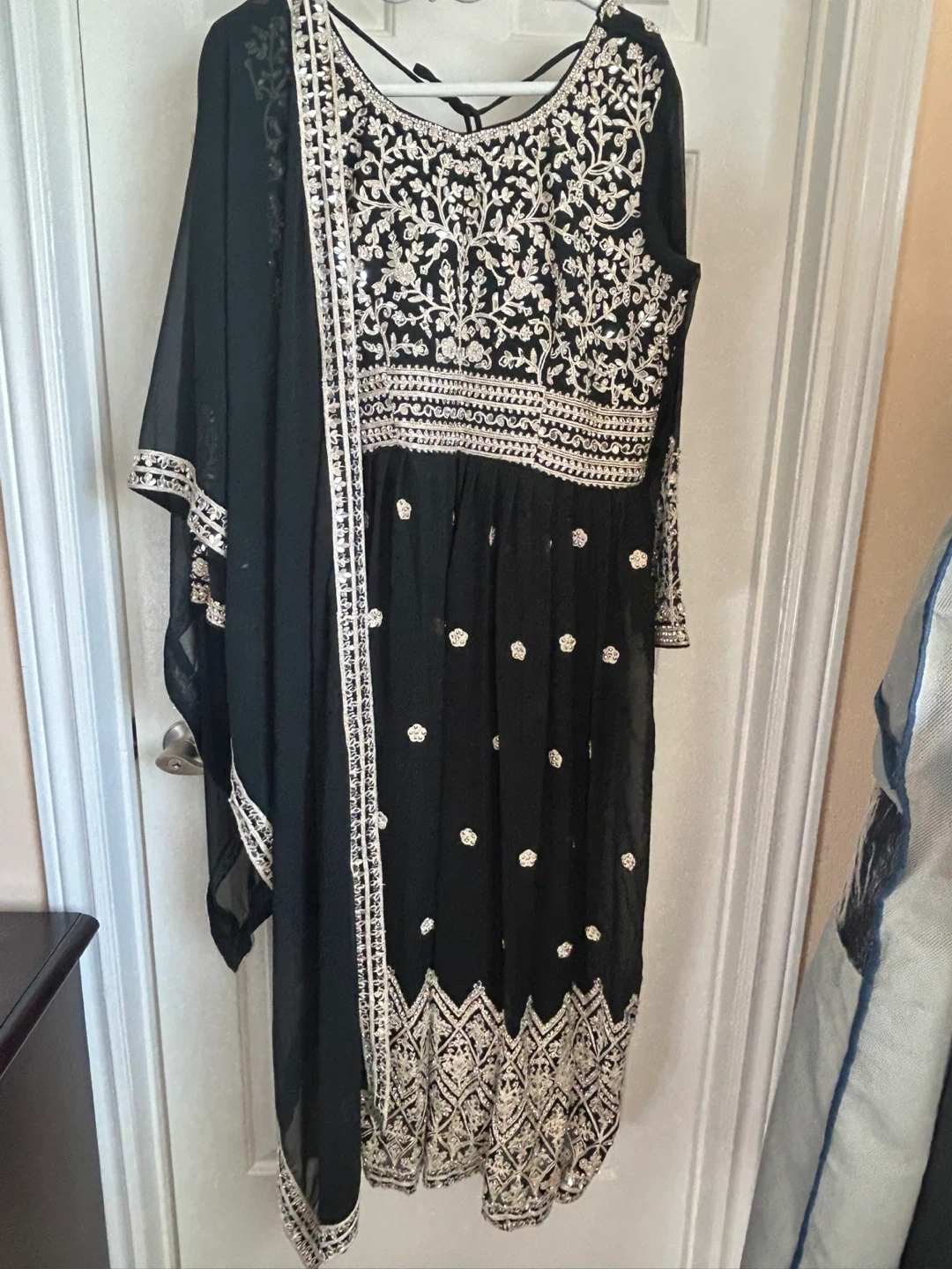 Beautiful black plazo with intricate silver embroidery. Perfect for special occasions or a night out. Flowing and elegant!
