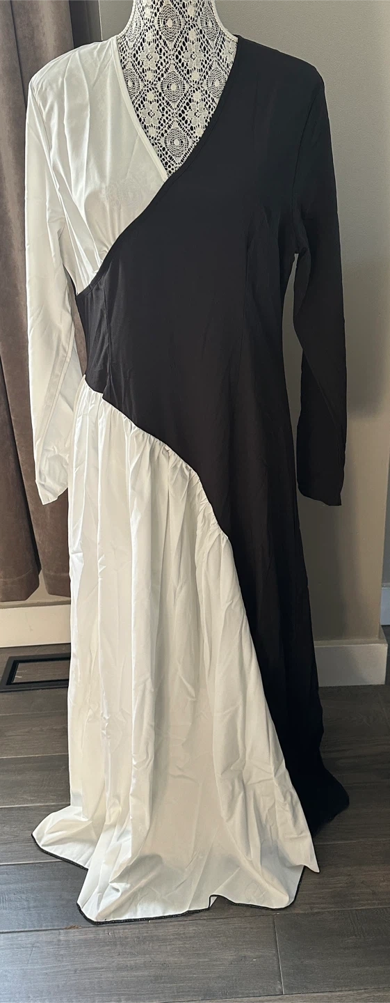 Here's a stylish long-sleeve dress featuring a unique black and white colour block design. New, never worn and ready for a new home! Brand unknown - new, never worn Size is 22 inches across the chest and 56 inches in length