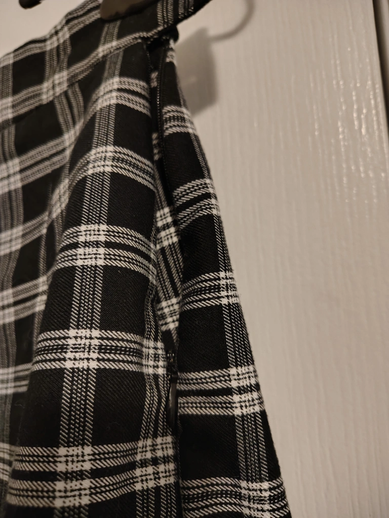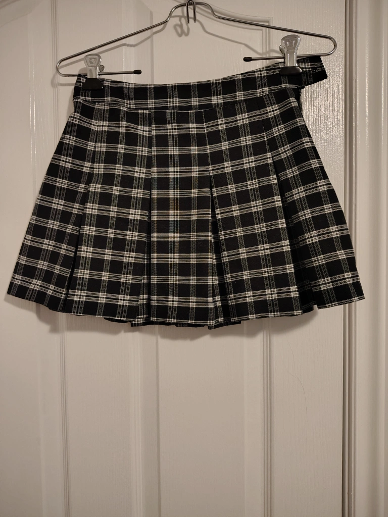 Here's a cute black and white plaid pleated mini skirt! It's in great condition and ready for a new home. Perfect for adding a touch of retro style to your wardrobe or costume. mini skirt length, size 2! pleats stay intact and very easy to style!