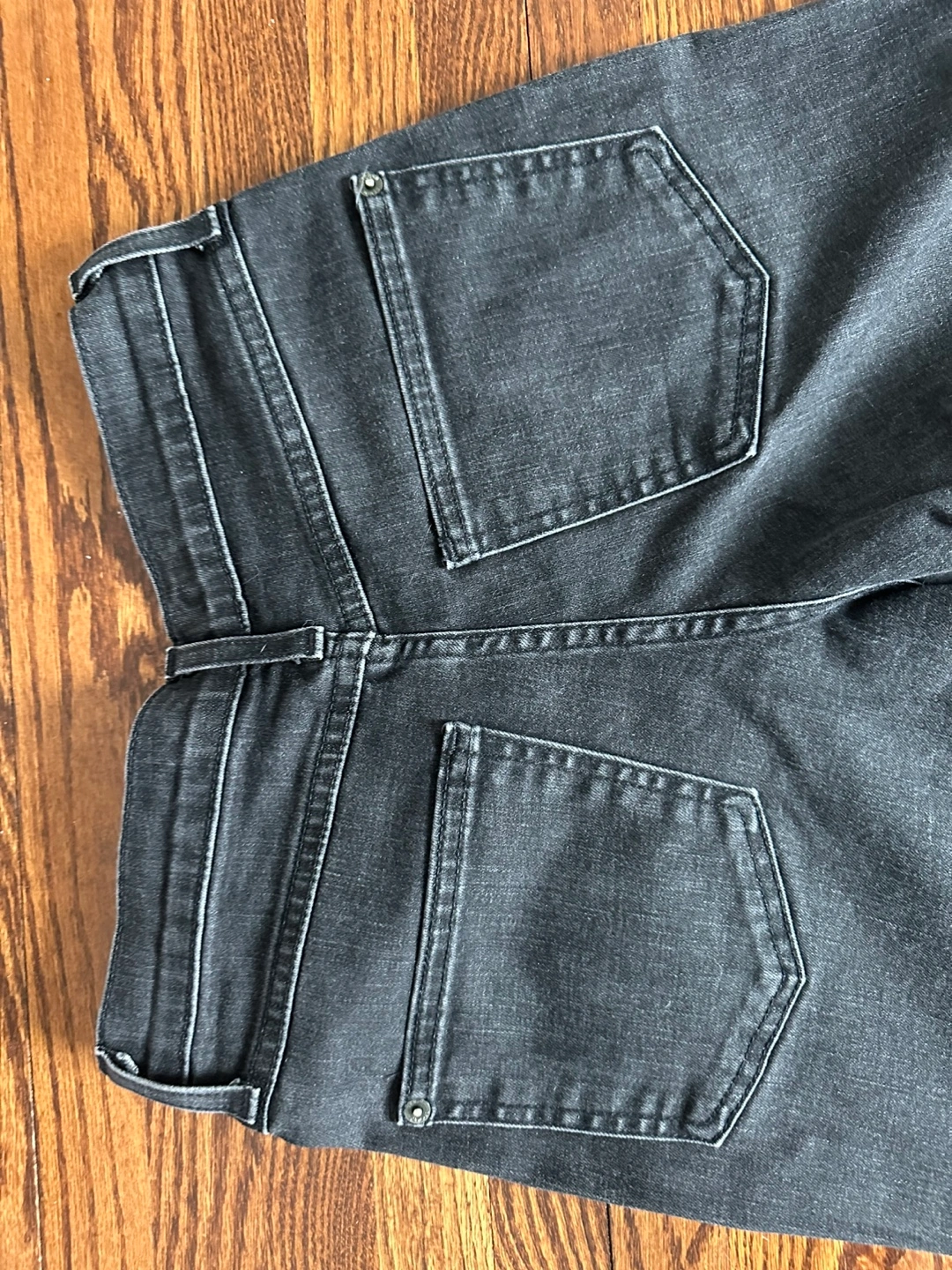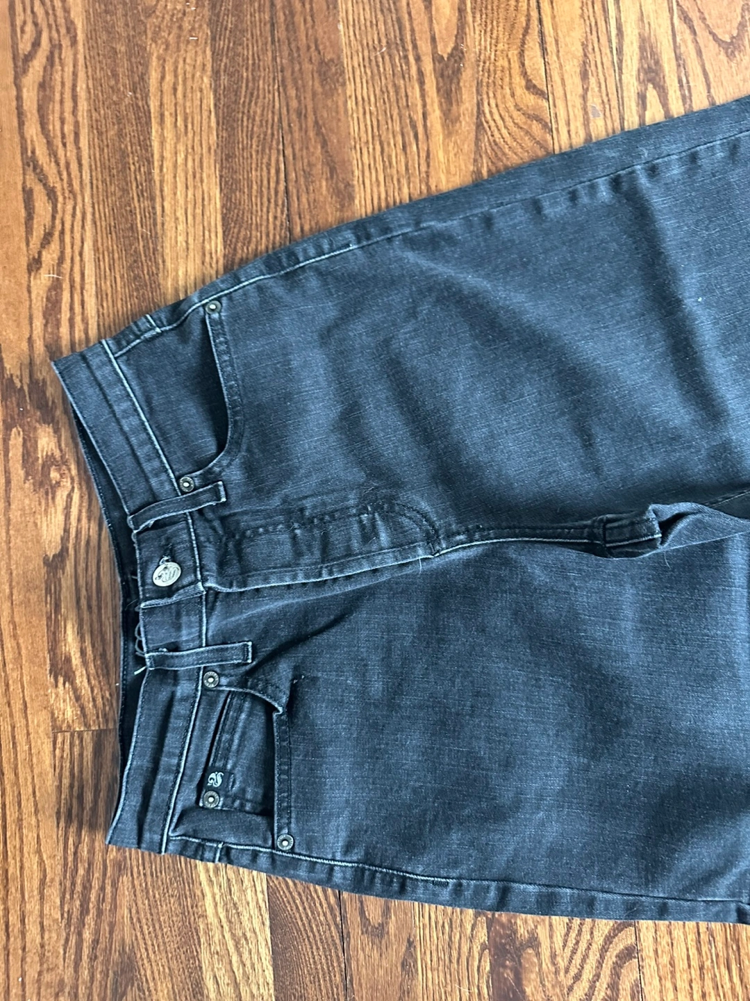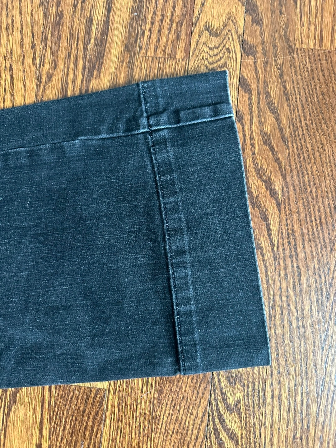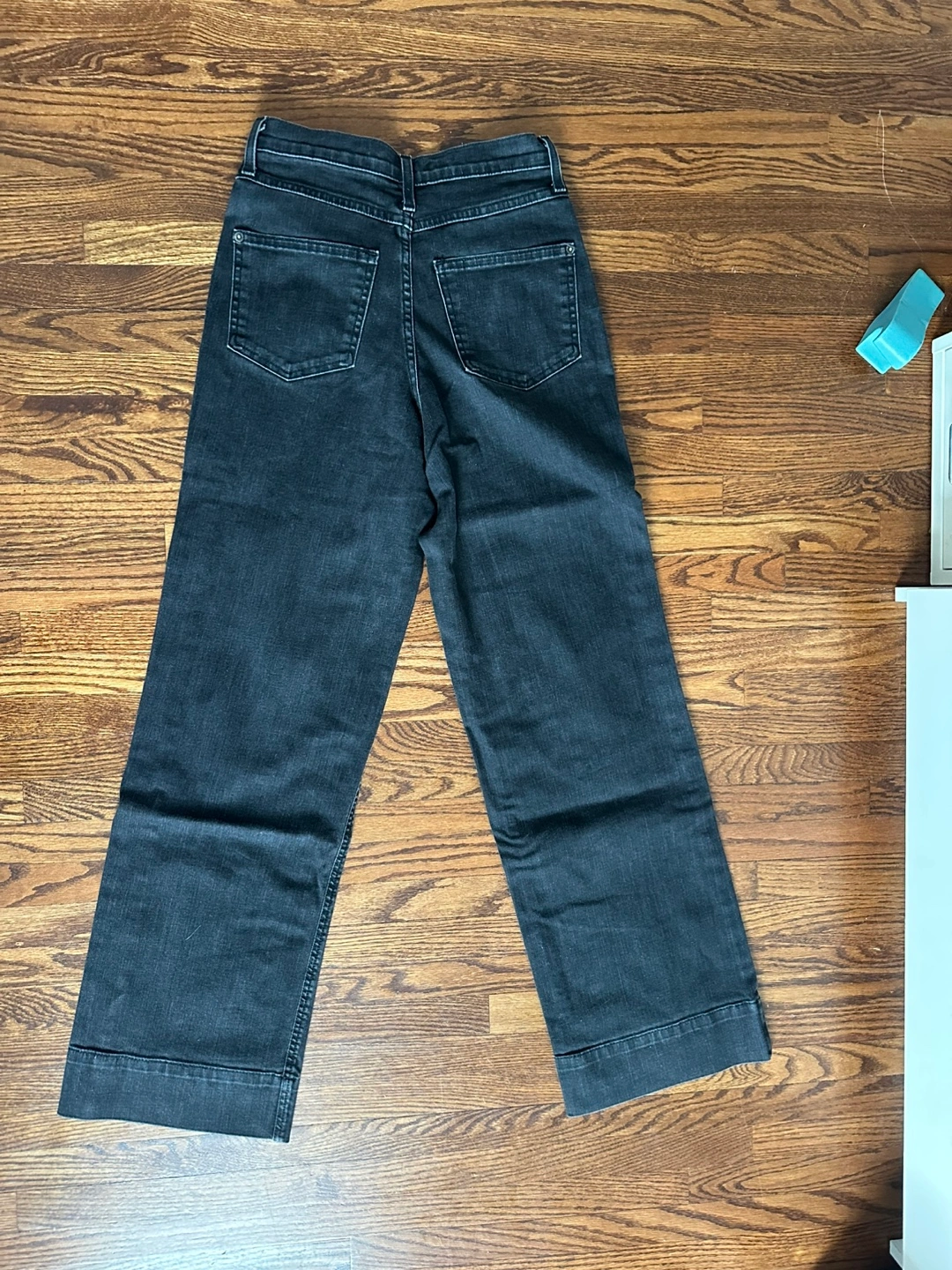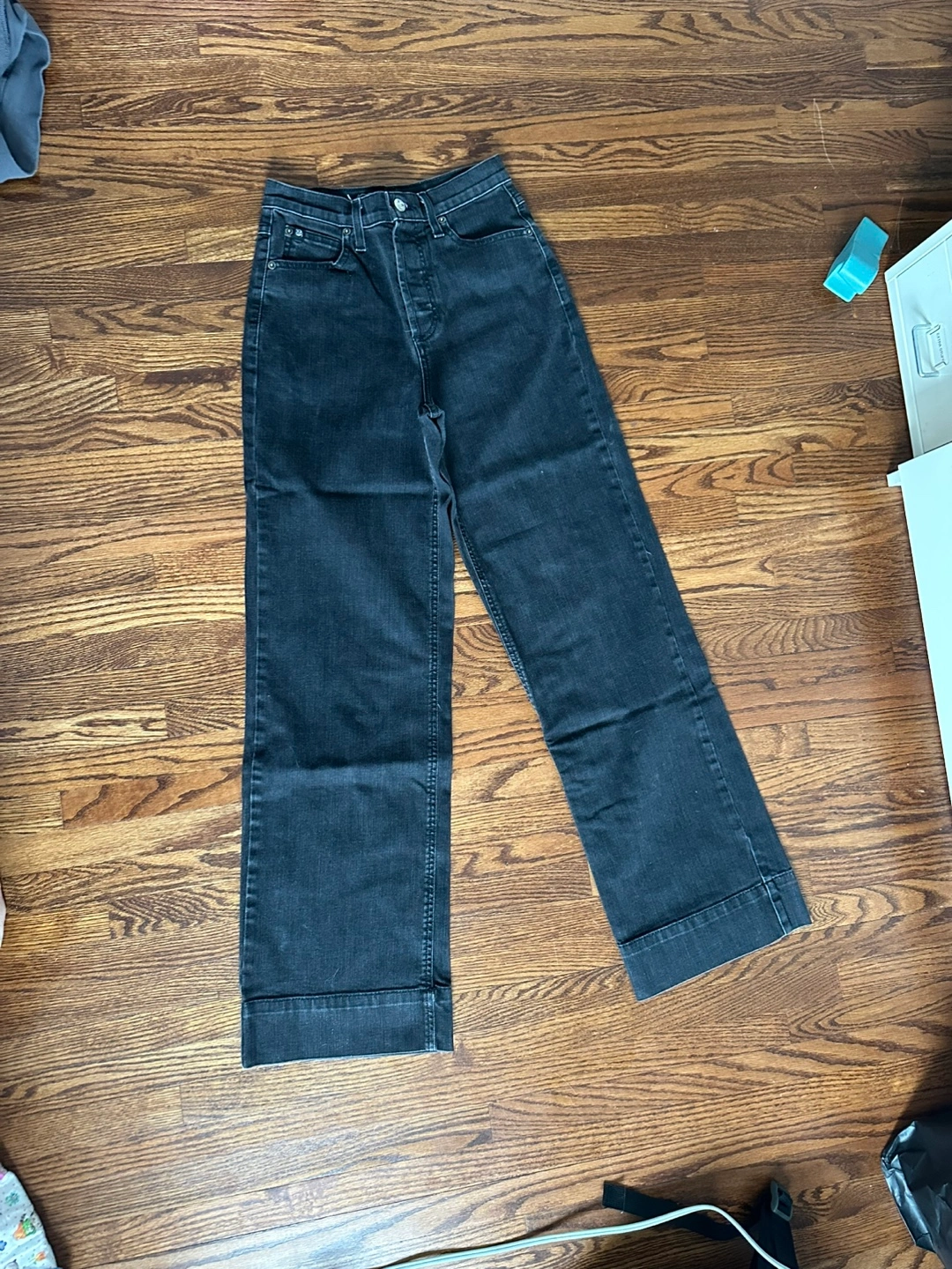 Dark wash wide leg jeans. High waisted. Unique long hems. Excellent condition.