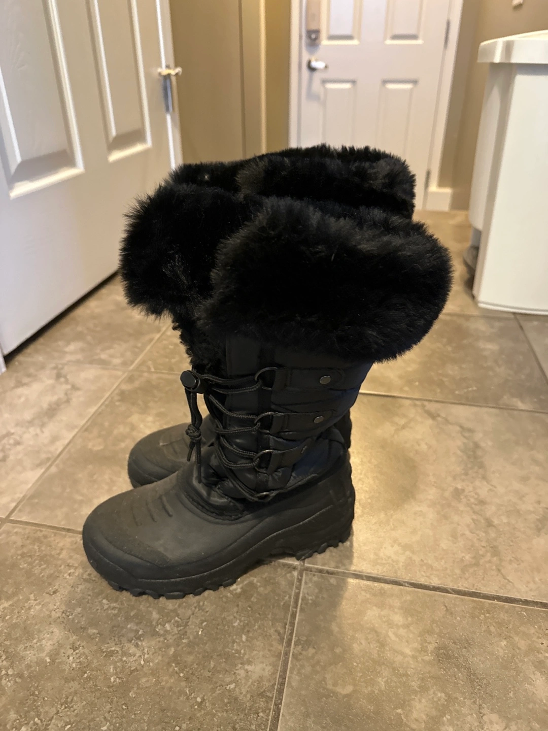 Cozy and warm black winter boots featuring a stylish faux fur trim! These boots are perfect for braving the Canadian winter. They appear to be in good condition and ready for a new home. Perfect for keeping your feet warm and dry during snowy days!