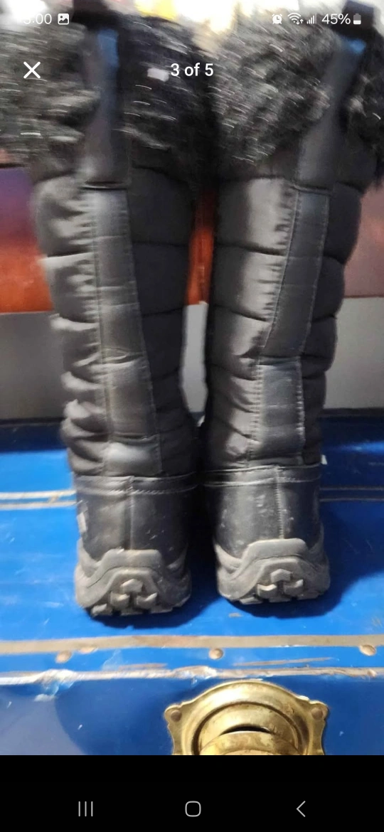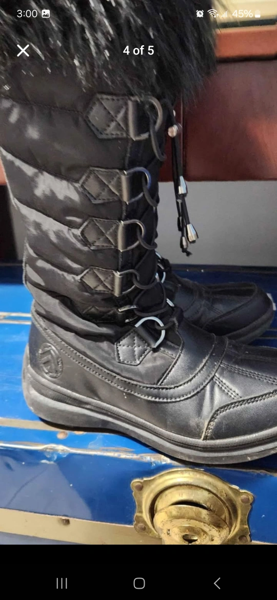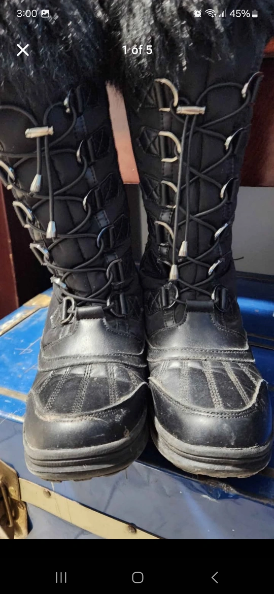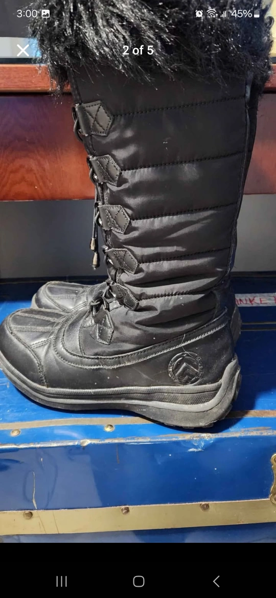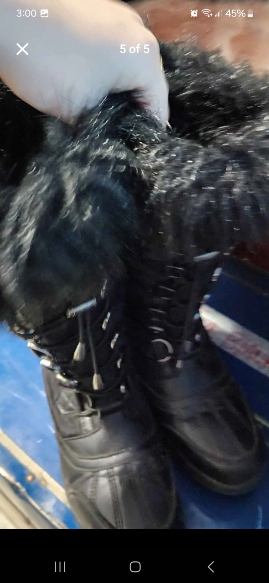 10These black winter boots are perfect for keeping your feet warm and dry during the cold months! They feature a stylish faux fur trim and a lace-up design for a secure fit. They are in barely use condition. its 30 or trade i can deliver