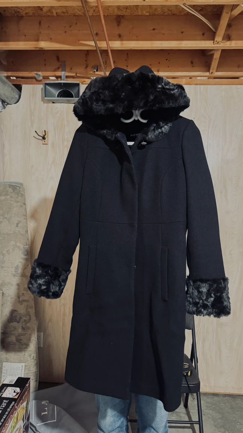 5Stylish black winter coat, featuring a cozy faux fur on the hood and cuffs. Perfect for staying warm and fashionable during the colder months!