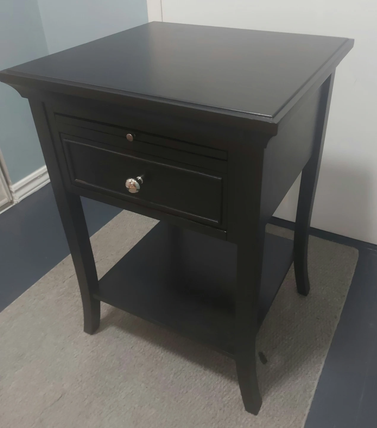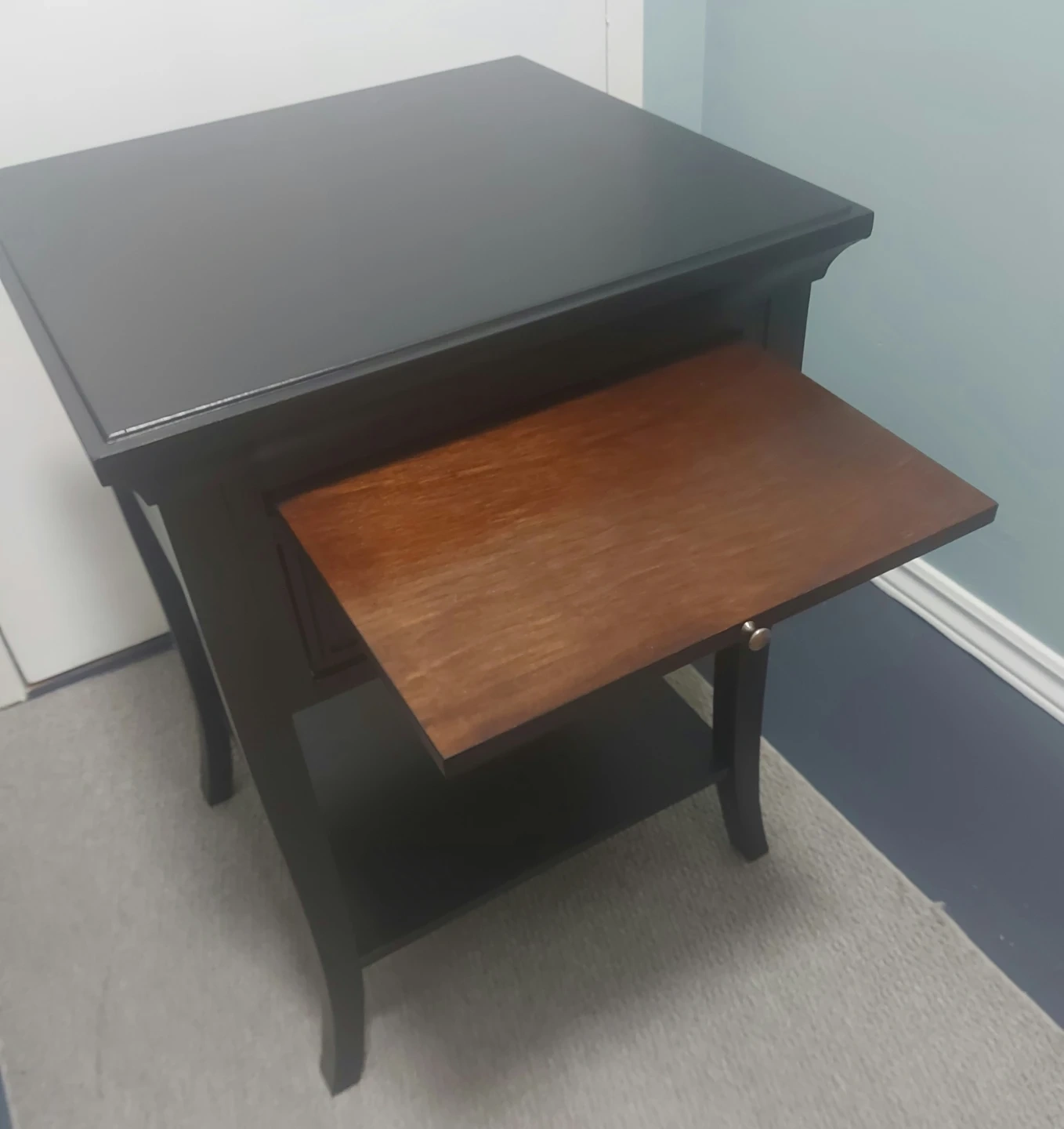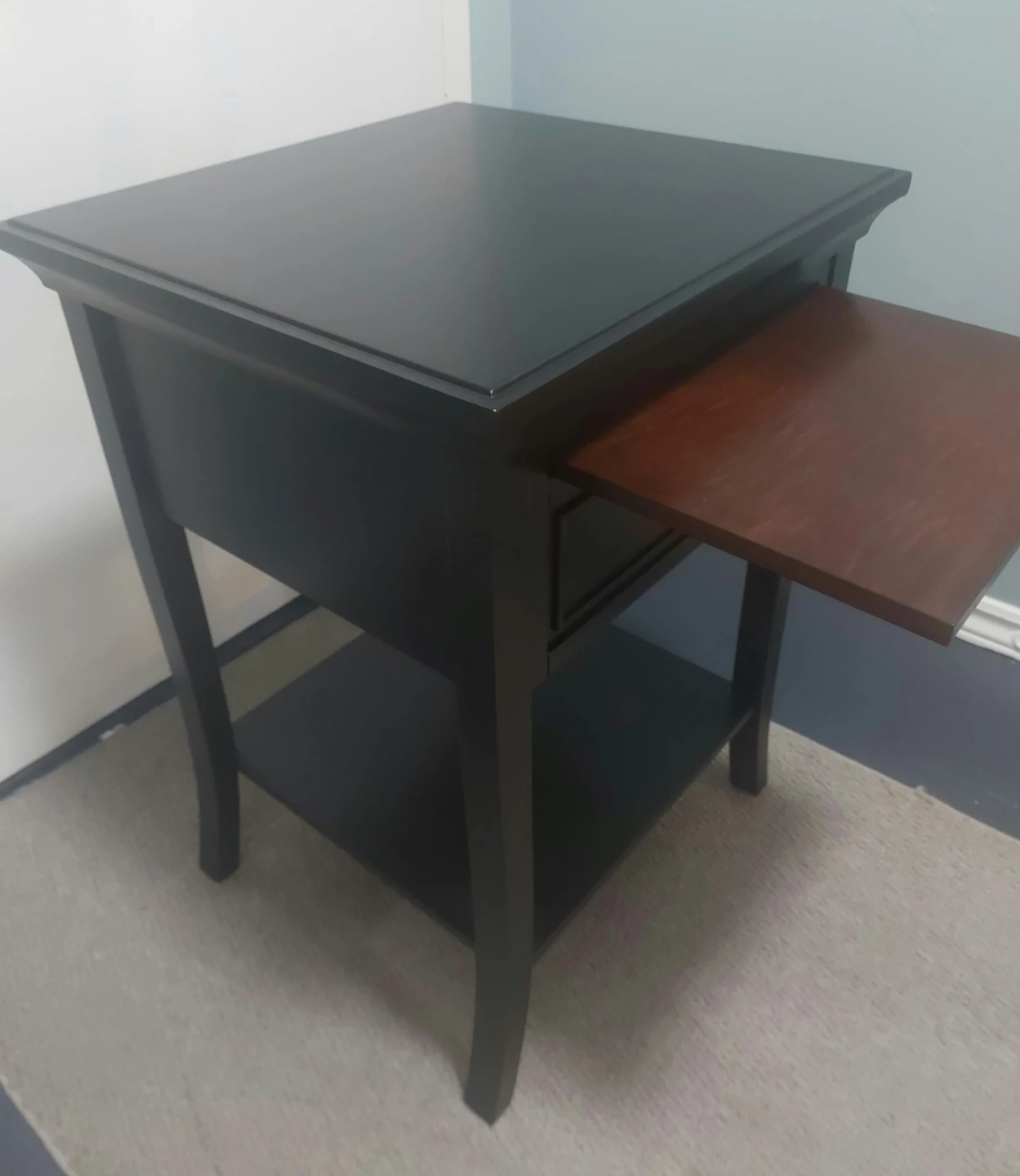 65Selling a lovely black wood end table! It features a drawer and a bottom shelf for extra storage. The top is a sleek black, while the pull-out writing surface is a warm brown wood tone. Perfect for adding a touch of elegance to any room!