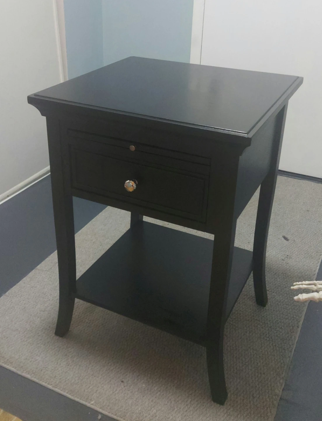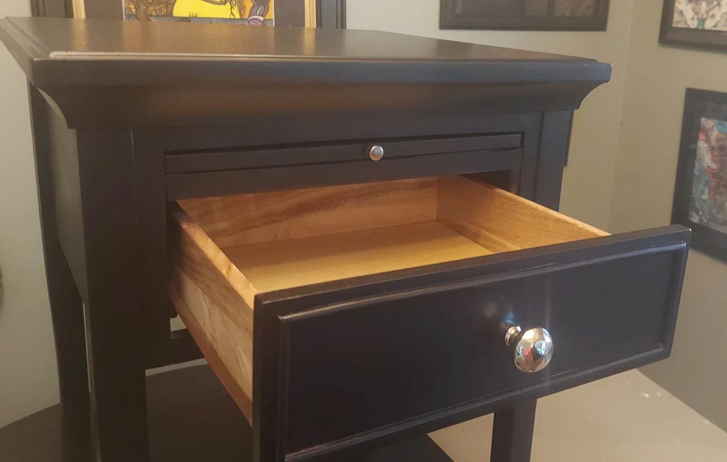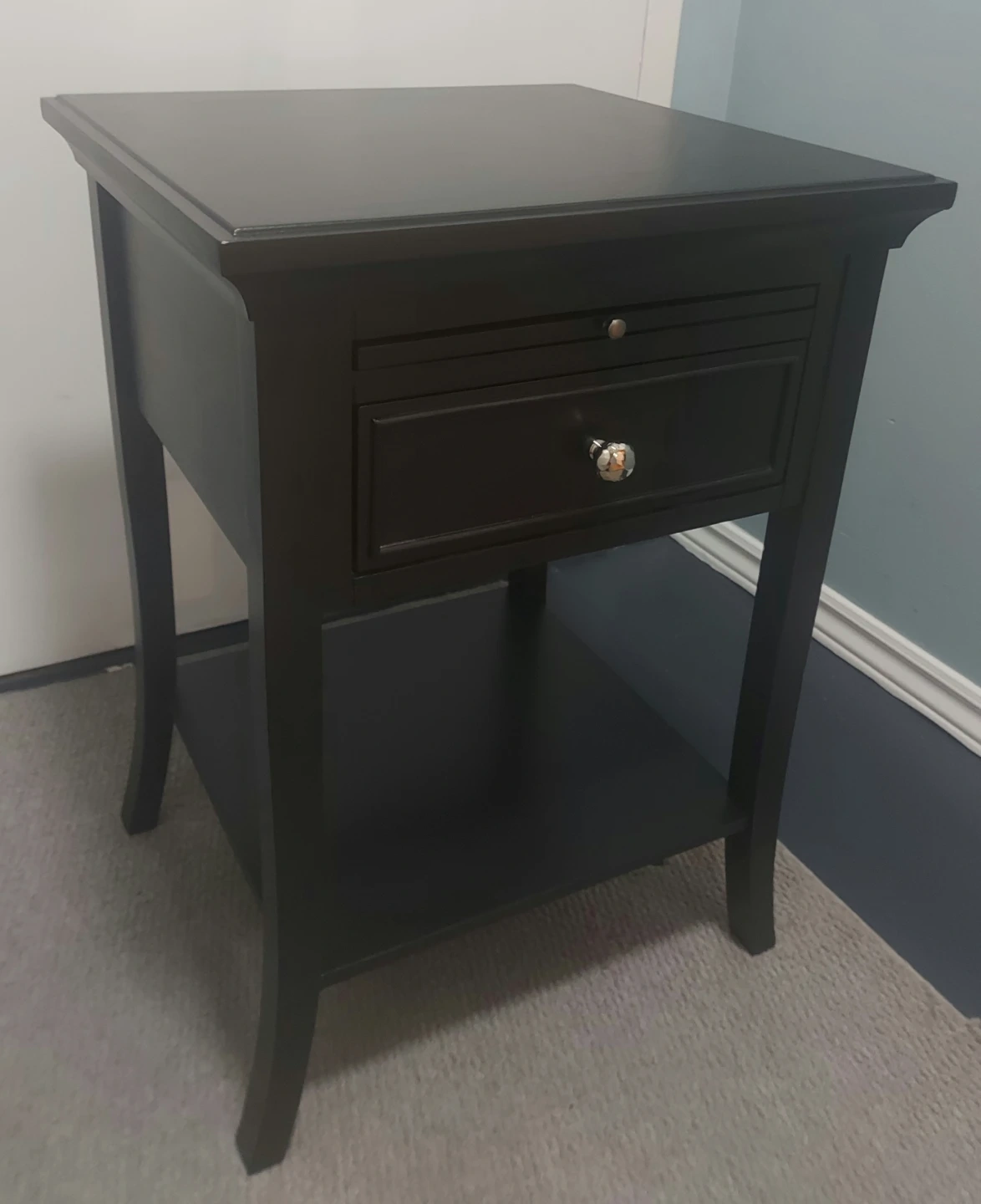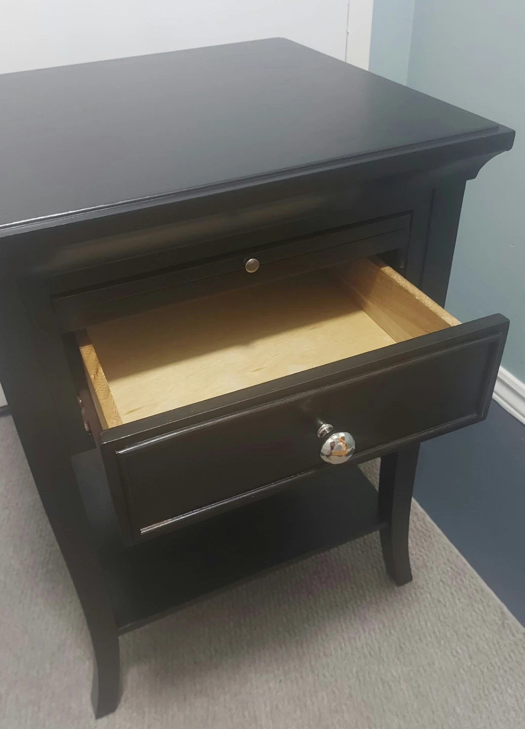 65Selling a lovely black wood end table! It features a drawer and a bottom shelf for extra storage. The top is a sleek black, while the pull-out writing surface is a warm brown wood tone. Perfect for adding a touch of elegance to any room!