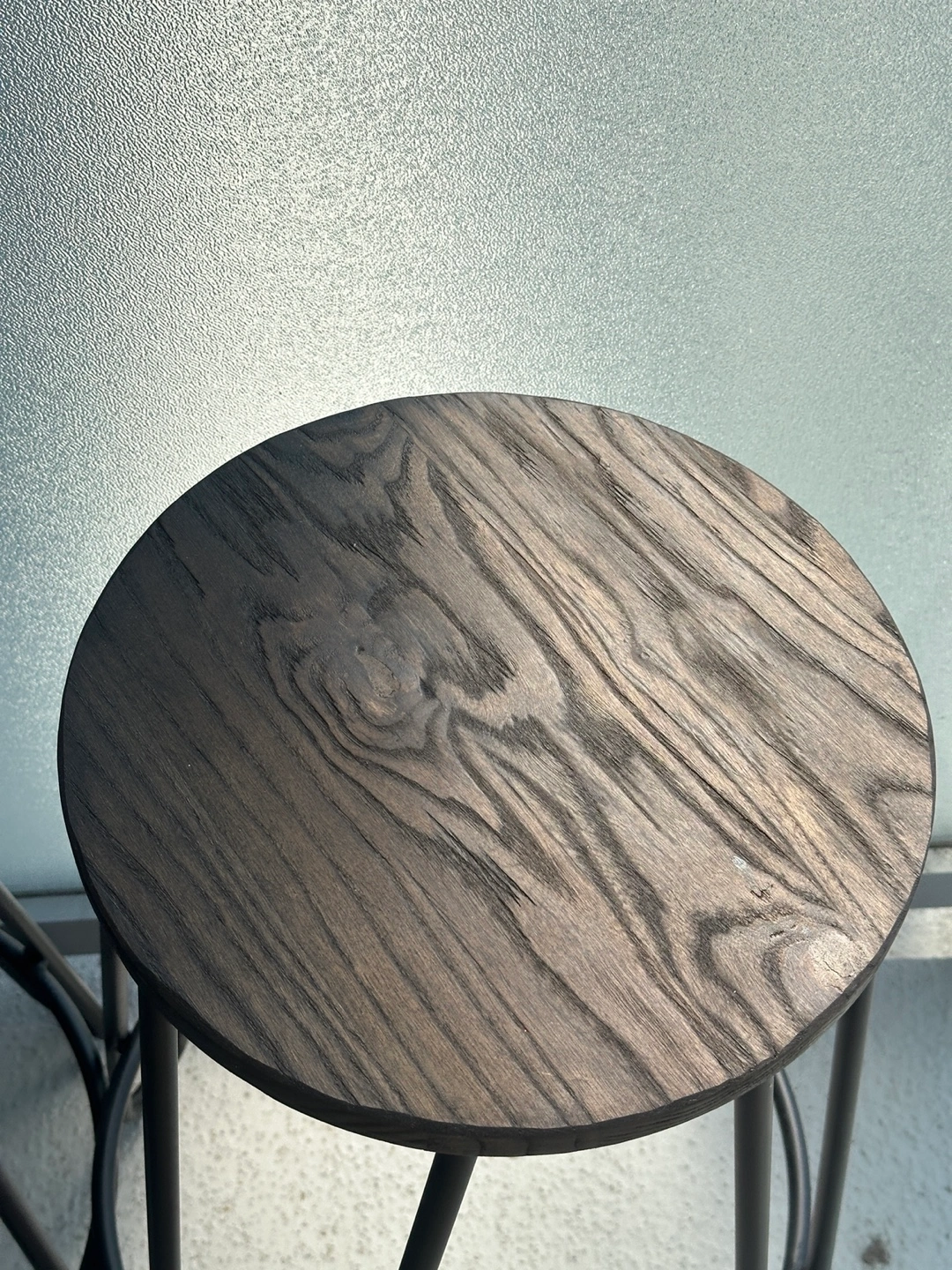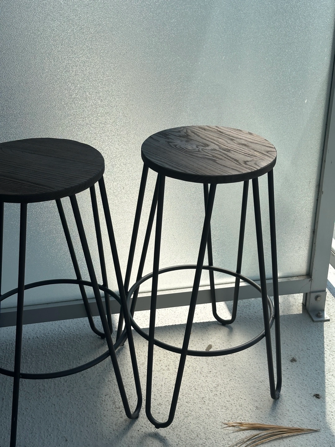 These bar stools feature a sleek black finish with a wood seat and metal legs. They're in great shape and would look fantastic in any kitchen or bar area. The round seat provides a comfortable place to sit, and the sturdy metal frame ensures stability