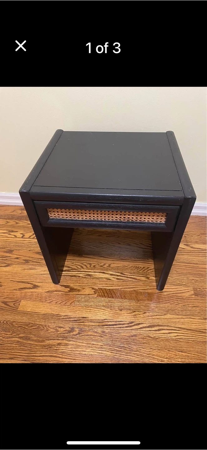 Here's a cute black nightstand! It's made of wood and features a rattan drawer, giving it a unique touch. It's in good condition and ready to find a new home. Perfect for adding a bit of style to your bedroom!