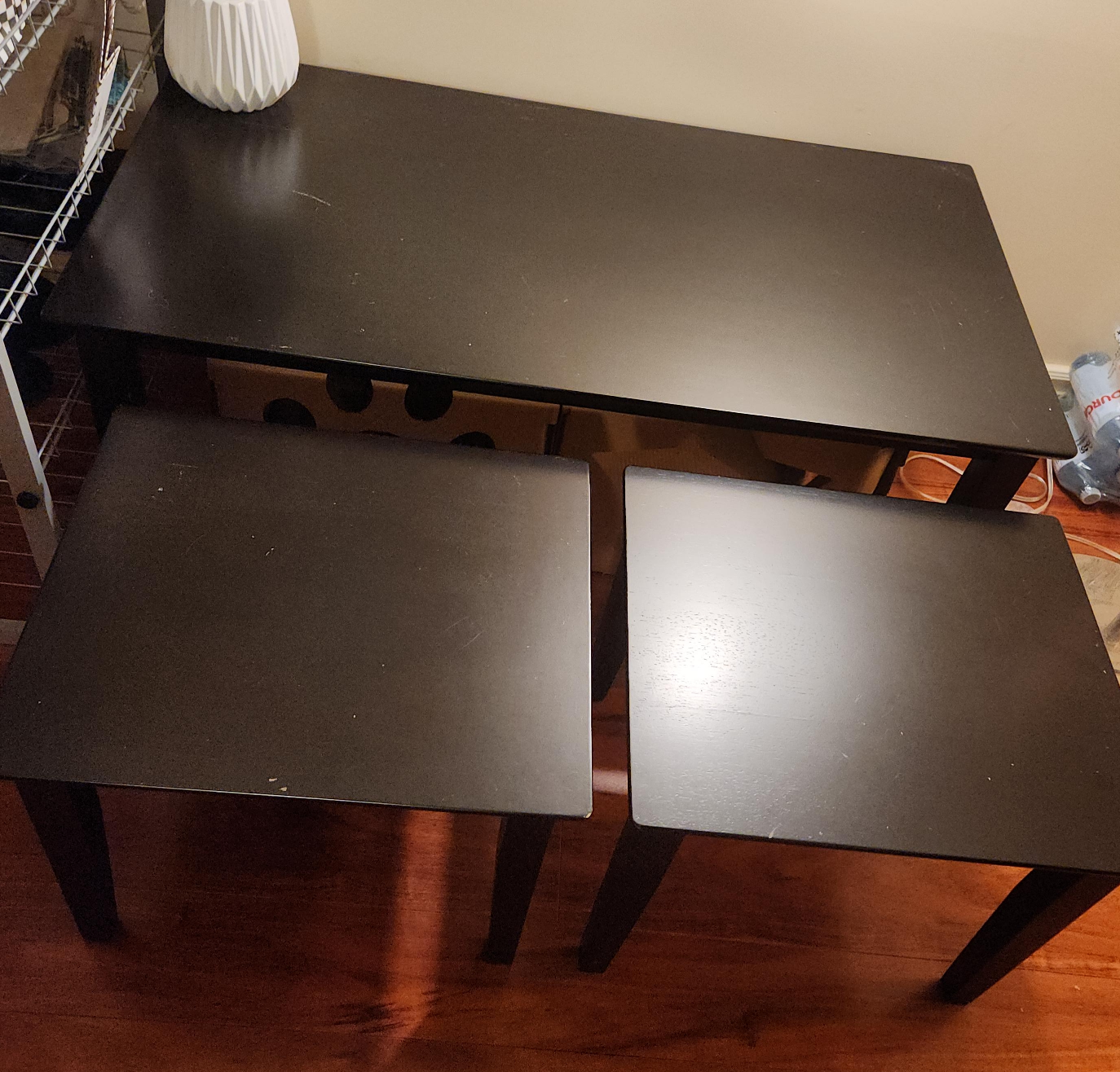 Selling a set of one coffee table and 2 black nesting tables. They're great for saving space and can be arranged in different ways. Perfect for a living room or bedroom!